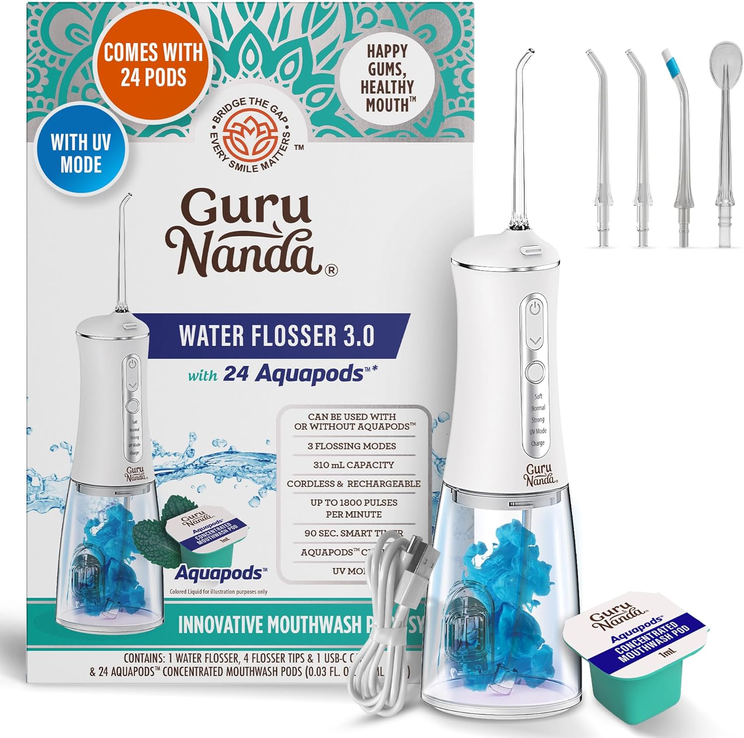 GuruNanda Advanced Dental Water Flosser 3.0 with UV Mode Water Flosser & 24 Aquapods with Mouthwash for Fresh Breath & Plaque Removal, Compact & TSA-Approved