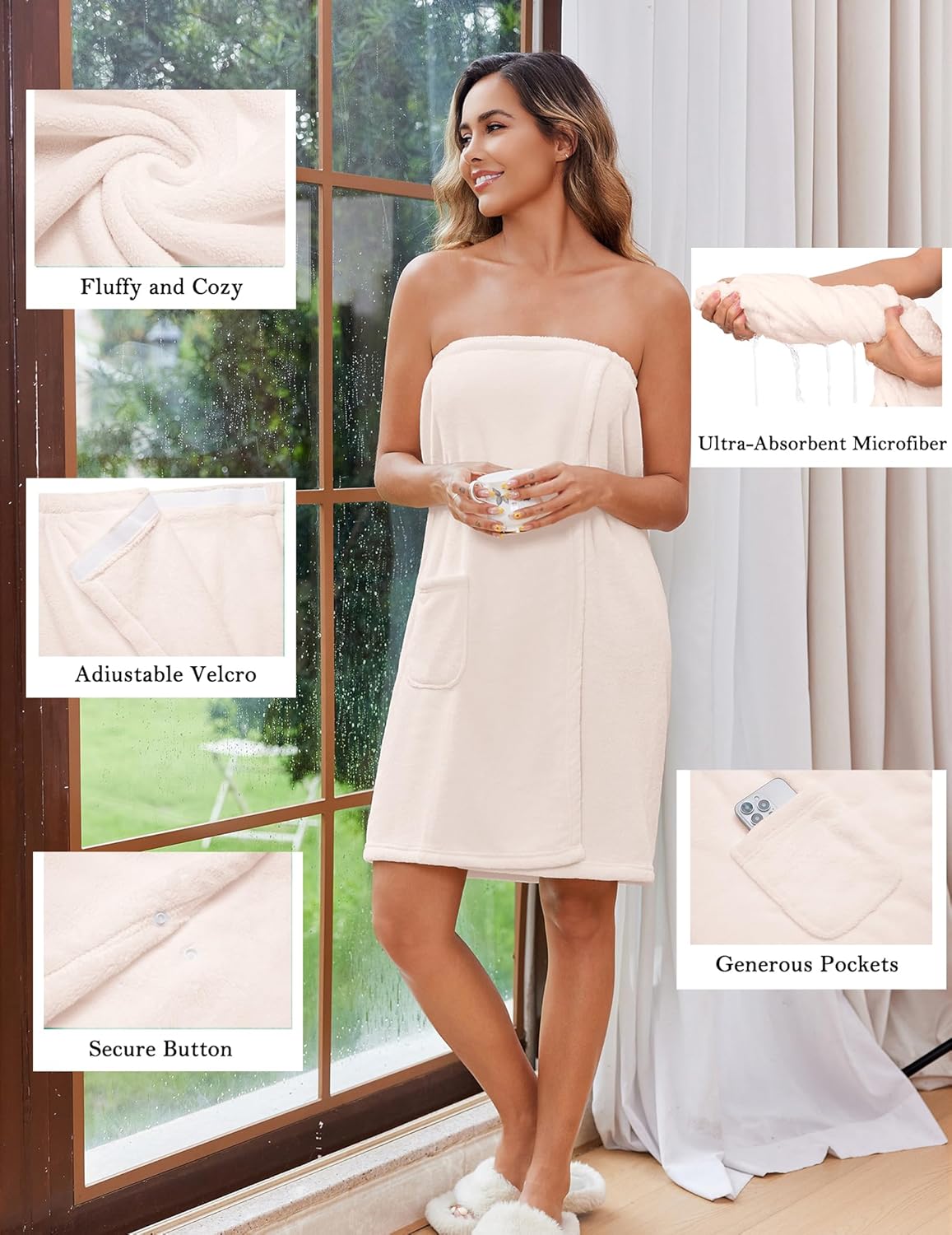 • 【Versatile 3-in-1 Design: Wrap, Robe & Cover-Up】More than just a shower wrap, this stylish piece functions as a bath robe wrap, a bath wrap dress, and even a chic poolside swim after wrap cover-up. Whether you're lounging at home or traveling, this wrap towel for women blends comfort and elegance effortlessly.