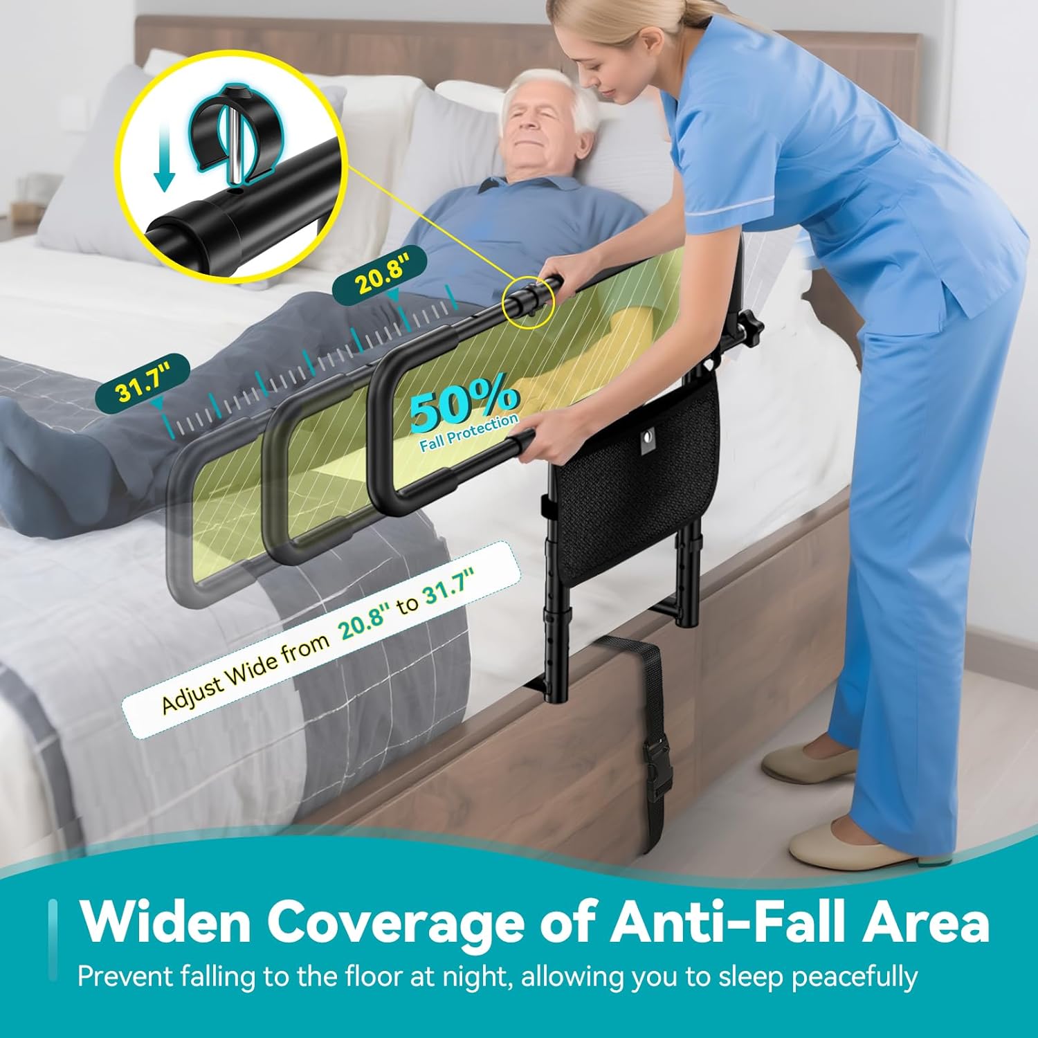 - Upgraded Retractable Bed Guard Rail: FORTEMOTUS bed handrails for seniors can be expended from 23.81"-31.69" wide (3 levels)to increase full-length barriers against roll-offs. Non-slip handle with soft foam grip to increase safety and comfort hold for elderly, disabled. Doubles as a sturdy bed cane assisting safe sitting/standing transitions