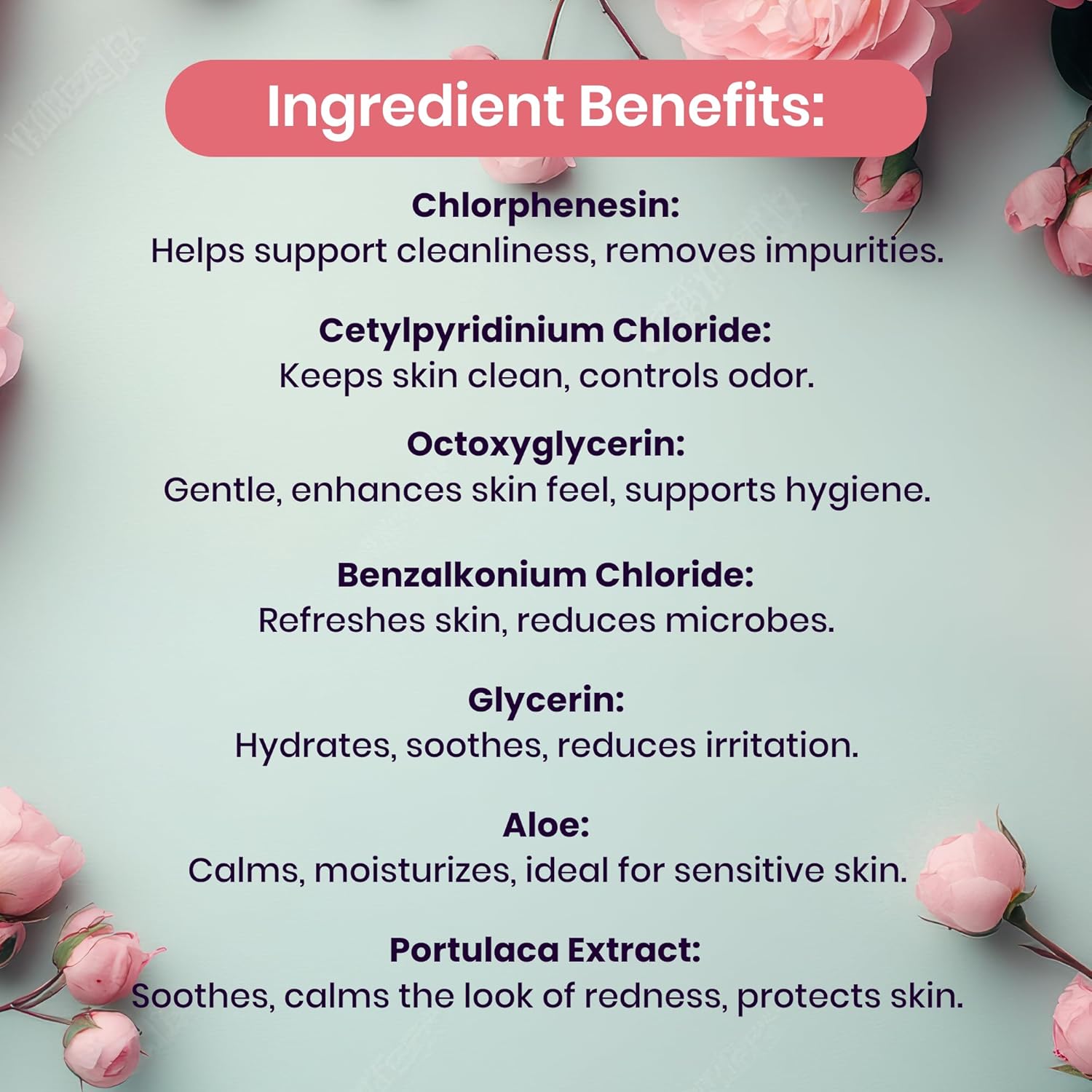 - SOOTHING BOTANICAL INGREDIENTS: Infused with calming aloe vera and antioxidant-rich purslane, these feminine hygiene wipes offer gentle hydration and relief for dry, itchy, or irritated skin. Perfect for post-wax, post-shave, or any time your skin needs a calming touch