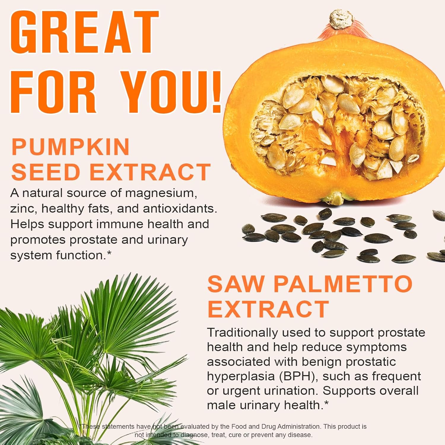 - Dual-Action Formula: Each softgel contains 1000mg of cold-pressed pumpkin seed oil + saw palmetto extract . This science-backed blend works synergistically to support urinary tract health in men, helping reduce frequent urination urgency.