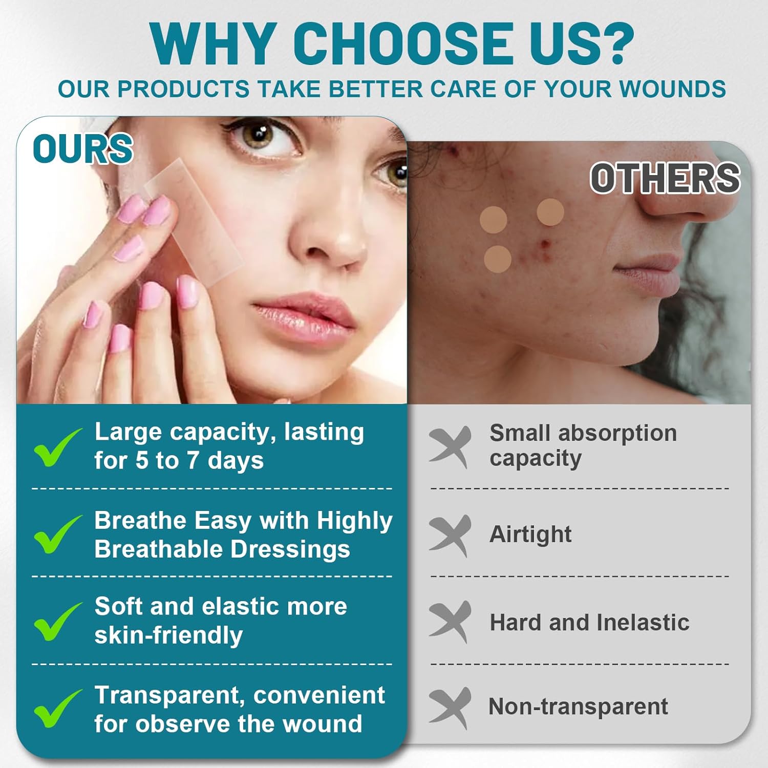 - Promote Wound Healing: This transparent hydrocolloid bandage not only provides a moist healing environment to minimize wound infection, but also absorb oils and exudates for 5-7 days without replacement. Breathable dressing promotes rapid healing and minimizes scarring.