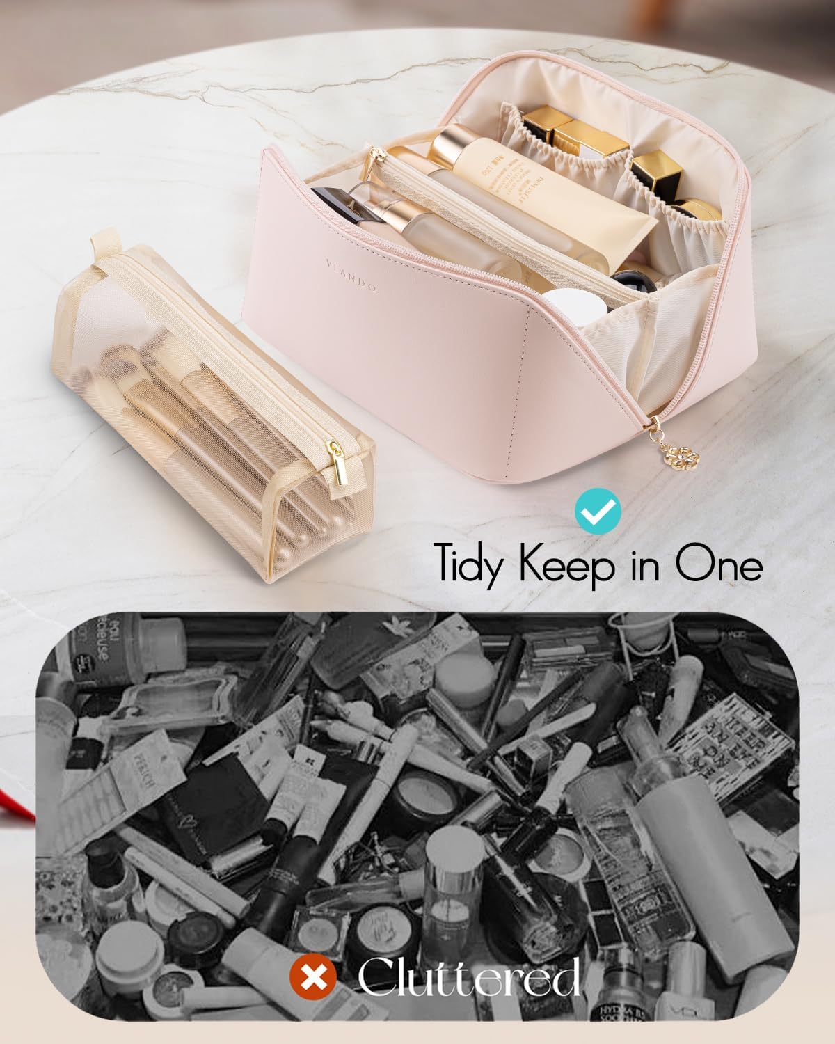 Vlando Makeup Bag,Large Capacity Travel Toiletry Bag,Cosmetic Bags for Women PU Leather Waterproof Portable Pouch with Divider & Handle-Apricot Pink