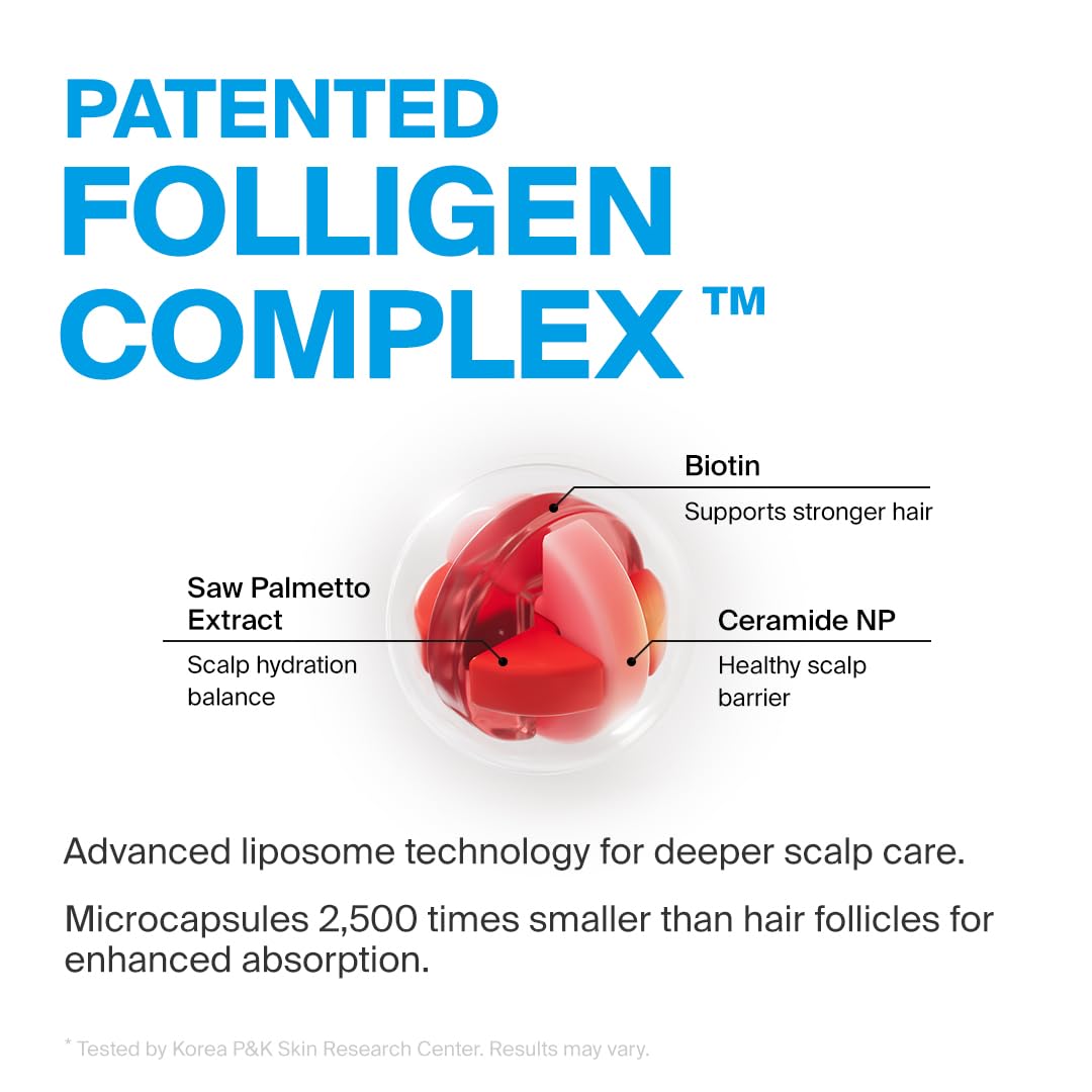 - Folligen Complex for Scalp Care: Our patented Folligen Complex supports scalp strength and elasticity while promoting thicker, fuller-looking hair. With particles 25,000 times smaller than pores, active ingredient absorption is maximized.