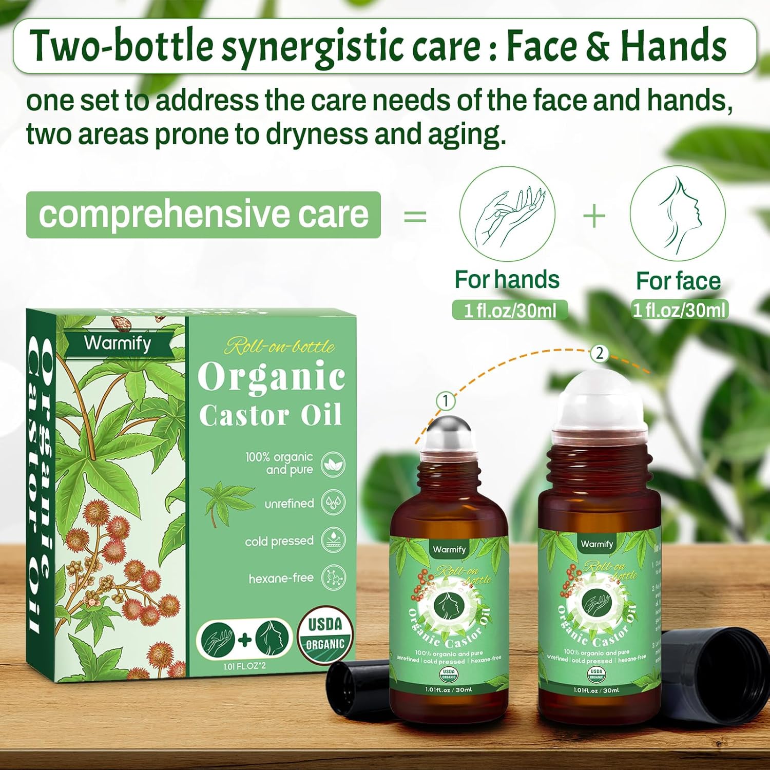 2-in-1 Castor Oil Roll On for Face & Hands, Organic Cold Pressed, Hexane-Free, Unrefined Glass Bottle – Targeted Roller Balls for Eye, Lip, Skin, Nail & Cuticle Care – 2 x 1 fl.oz