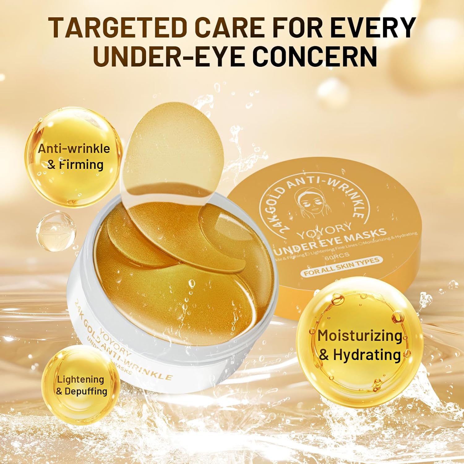 - Gold-Infused Anti-Aging Solution - 24K gold particles combined with nourishing hydrogel visibly brighten and rejuvenate tired under-eyes for a more youthful appearance.