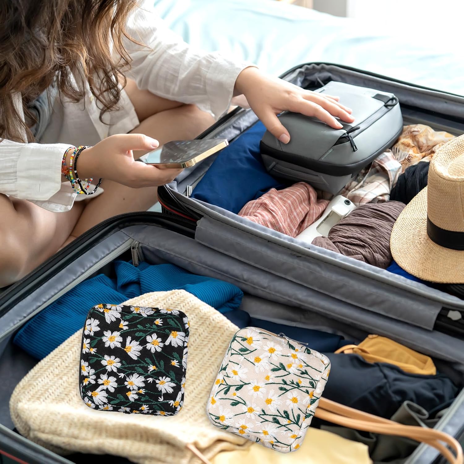 - Elegant Design Period Bag: Featuring daisy embroidery, this period pouch adds a touch of elegance to your essentials. The distinctive design ensures your sanitary napkin storage bag is both practical and visually appealing, suitable for women and teen girls