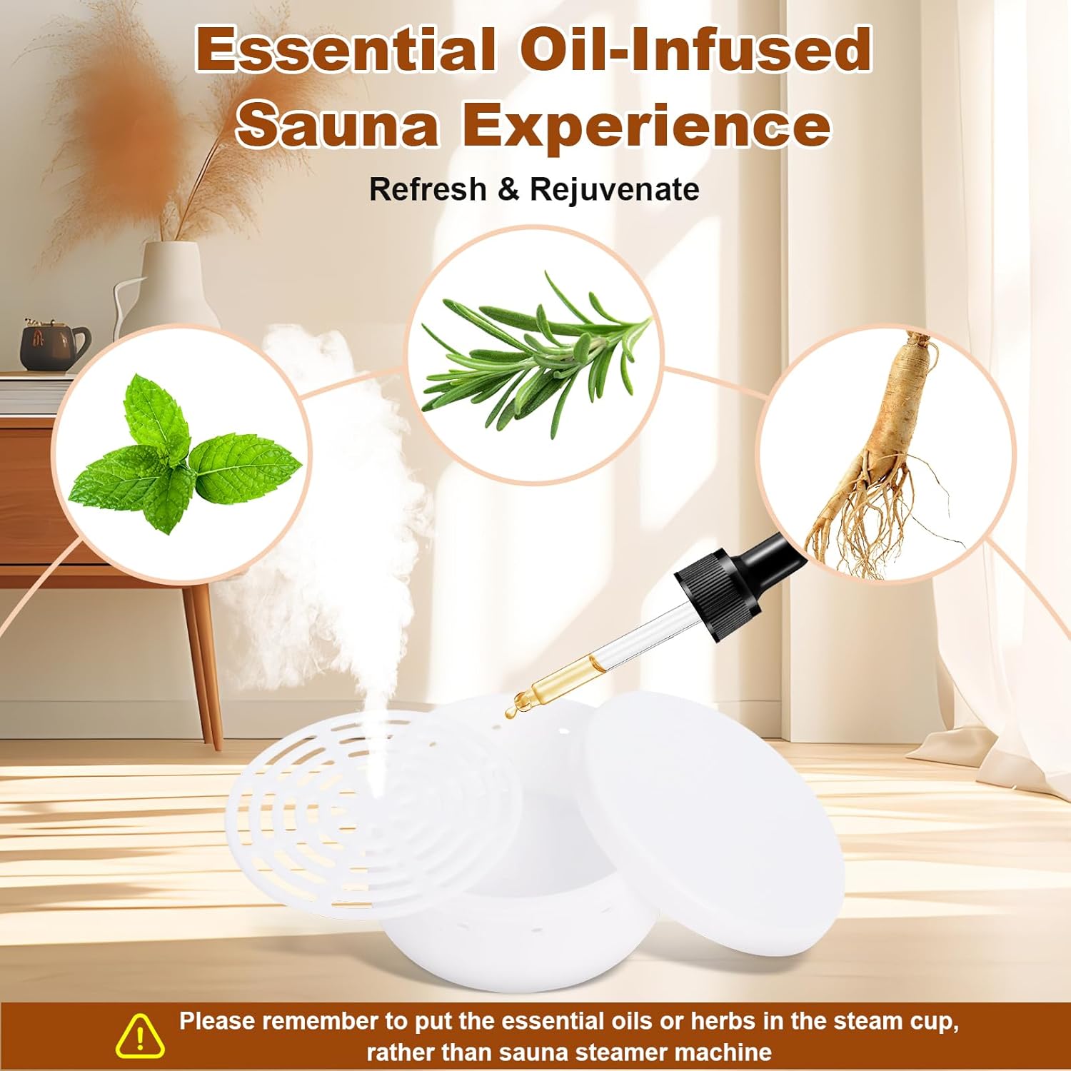 - 【PLEASE NOTE】The key to the whole operation of the steam system is pushing the lid down and turning it to lock it into place. The steam generator can be used with aromatherapy oils or herbs, which should be placed only in the herbal box. Remember to fill the steamer with water before using it. Without water, the steamer will not generate steam and will automatically shut off. Please be reminded not to add essential oils into the steamer to prevent the lid from breaking