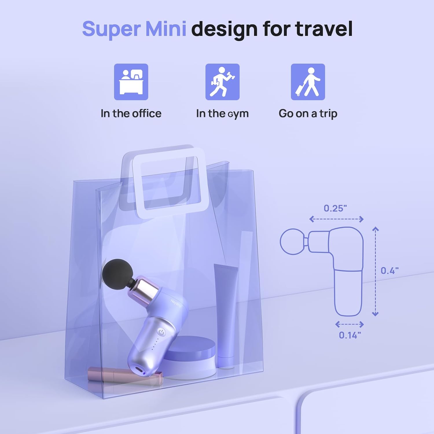- [Mini Pocket Design] Our mini massage gun features an ergonomic L-shaped design and a skin-friendly feel that's sure to please. Weighing only 0.6 pounds, it's easy to carry around, whether at the gym, at the office, or while traveling. It slips easily into bags and pockets for a relaxing massage.
