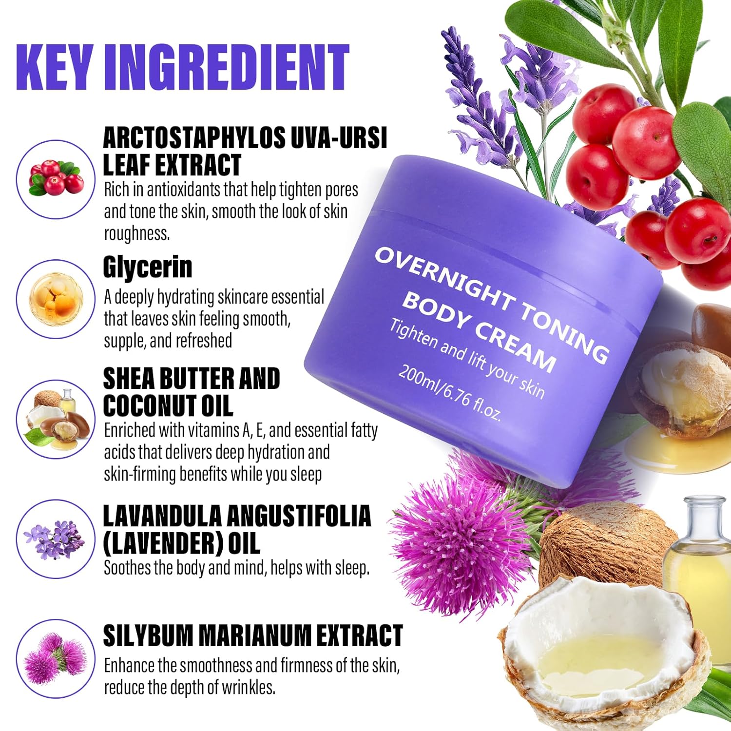 - Overnight Toning Whip: Wake up to smoother, firmer skin with our luxurious overnight toning whip. Designed to work while you sleep, our firming cream helps improve skin tone and texture, it not only enhances the skin's appearance but also moisturizes your skin and improves its elasticity.
