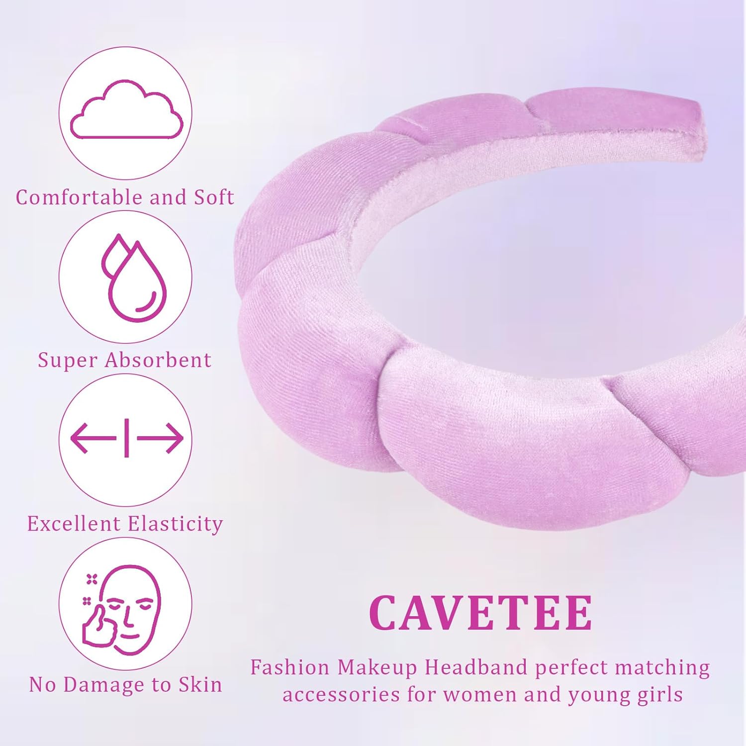 CAVETEE Spa Headband for Washing Face, Sink Care Headband for Women Sponge Bubble Makeup Head band for Women, Soft Velour Hair Accessoriesfor Girls (Purple, one size)