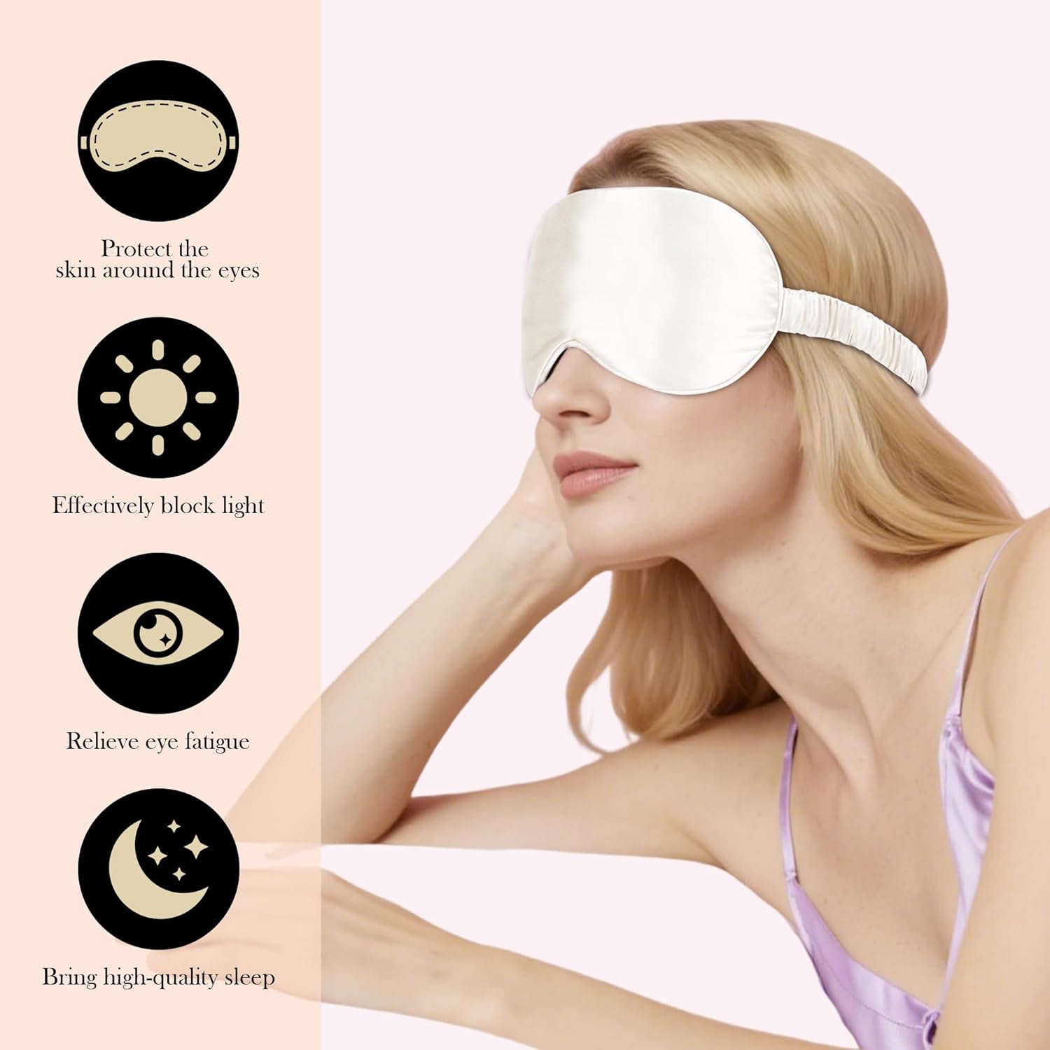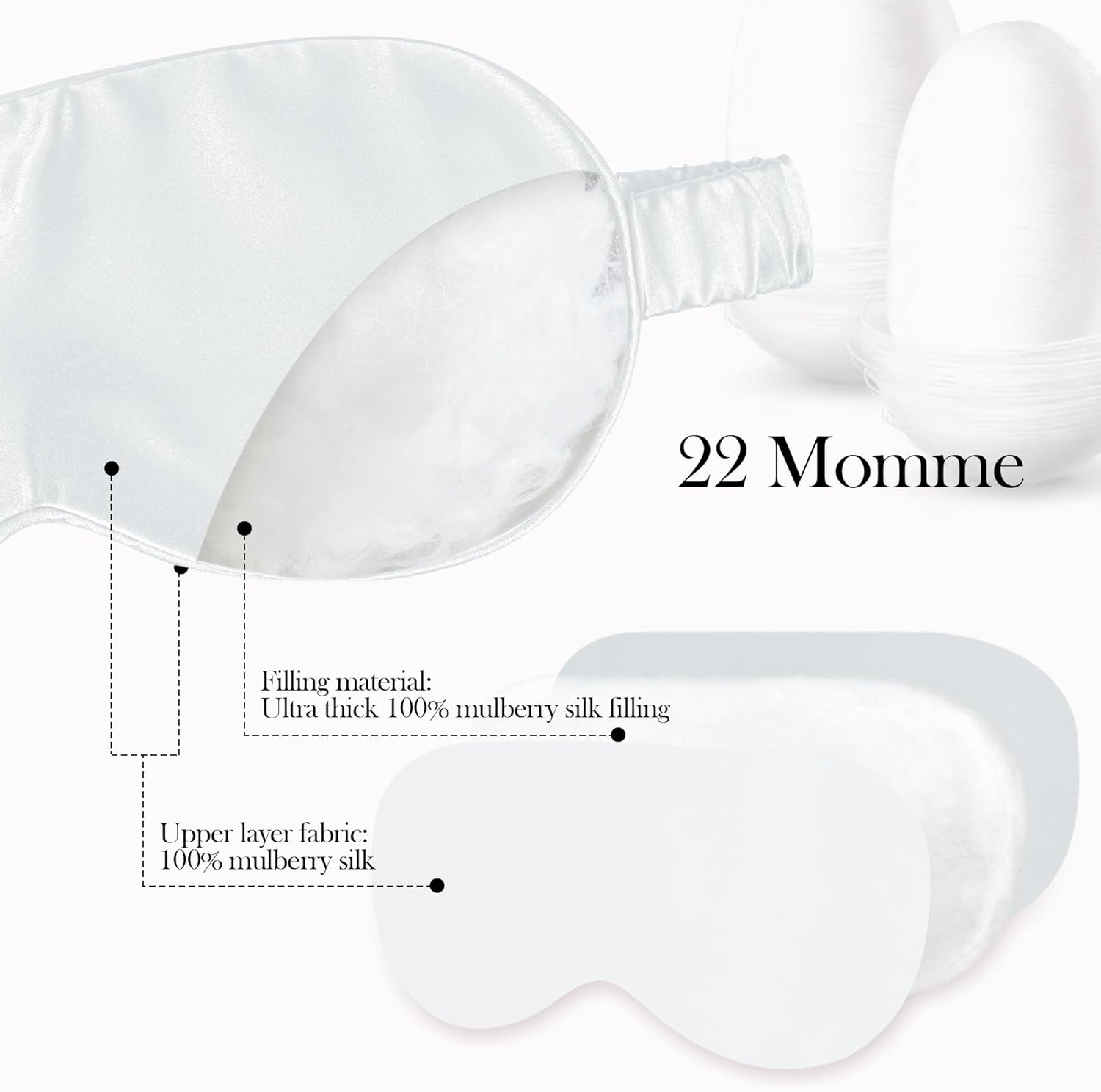 - [22 Momme Mulberry Silk , No Synthetic Blends]:Made with 22 momme silk fabric (higher density for durability), this sleep mask blackout is purely silk—zero polyester or synthetic additives.It's truely natura fabric ultra-smooth & skin-friendly.