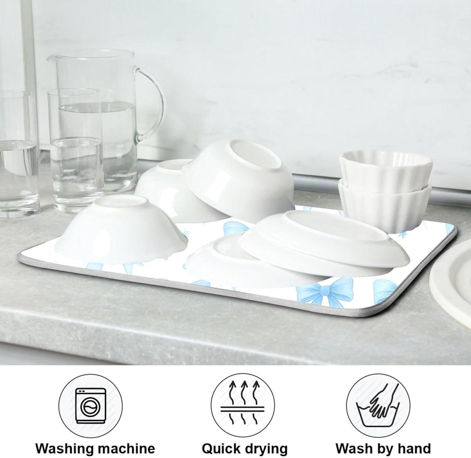 Blue Bow Ribbon Dish Drying Mat for Kitchen Countertop 16x18 Bowknot White Coquette Pattern Small Drying Mat Reusable Quick Dry Dish Sink Mats Easy Clean Decorative Essentials