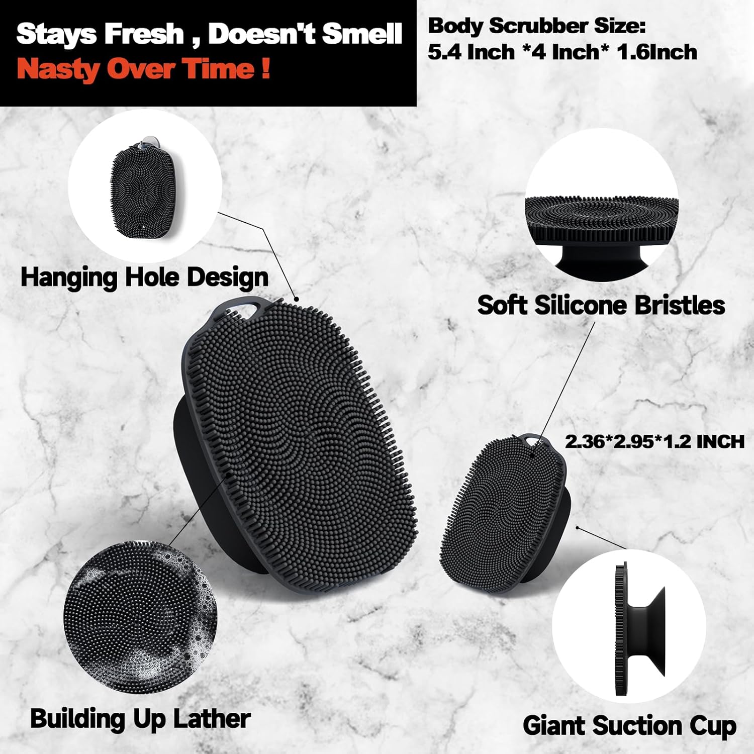 Soft Silicone Body Scrubber, Gentle Like a Hand Exfoliating Your Skin and Build Up Lather, Back Large Suction Cup Easy to Store, & Deep Clean (Body Scrubber + Face Scrubber Black)
