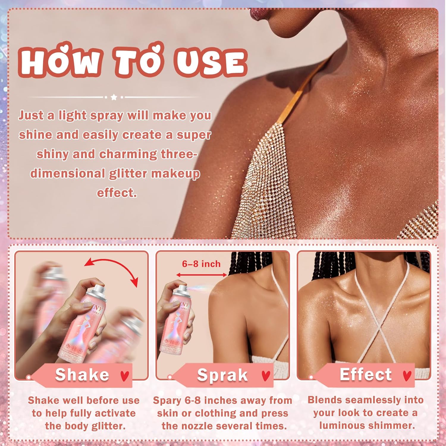 - 【Easy to Use】Shake well before use to ensure even distribution of the glitter.Spray 6-8 inches from the skin,allowing the glitter to adhere gently for a unique sparkling effect