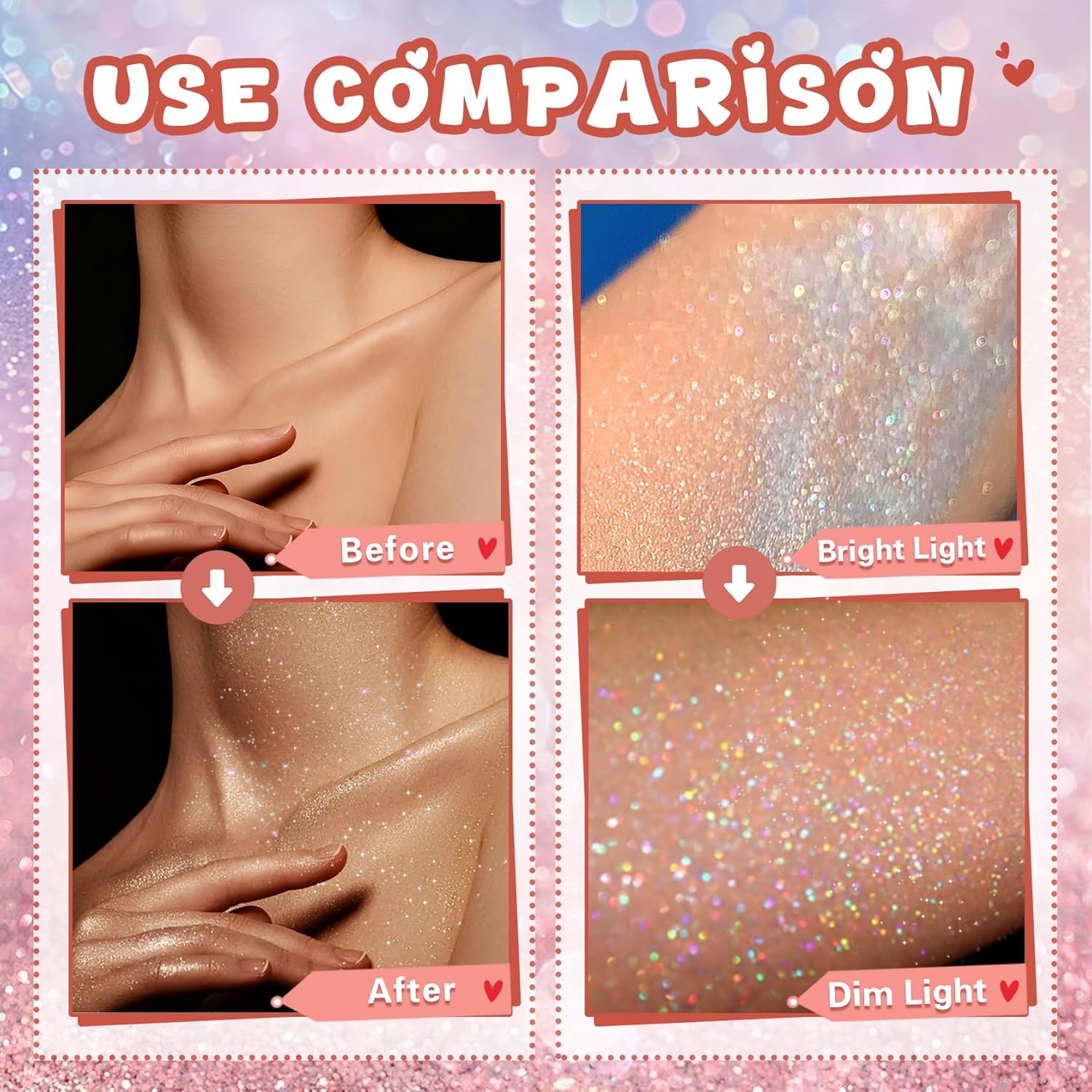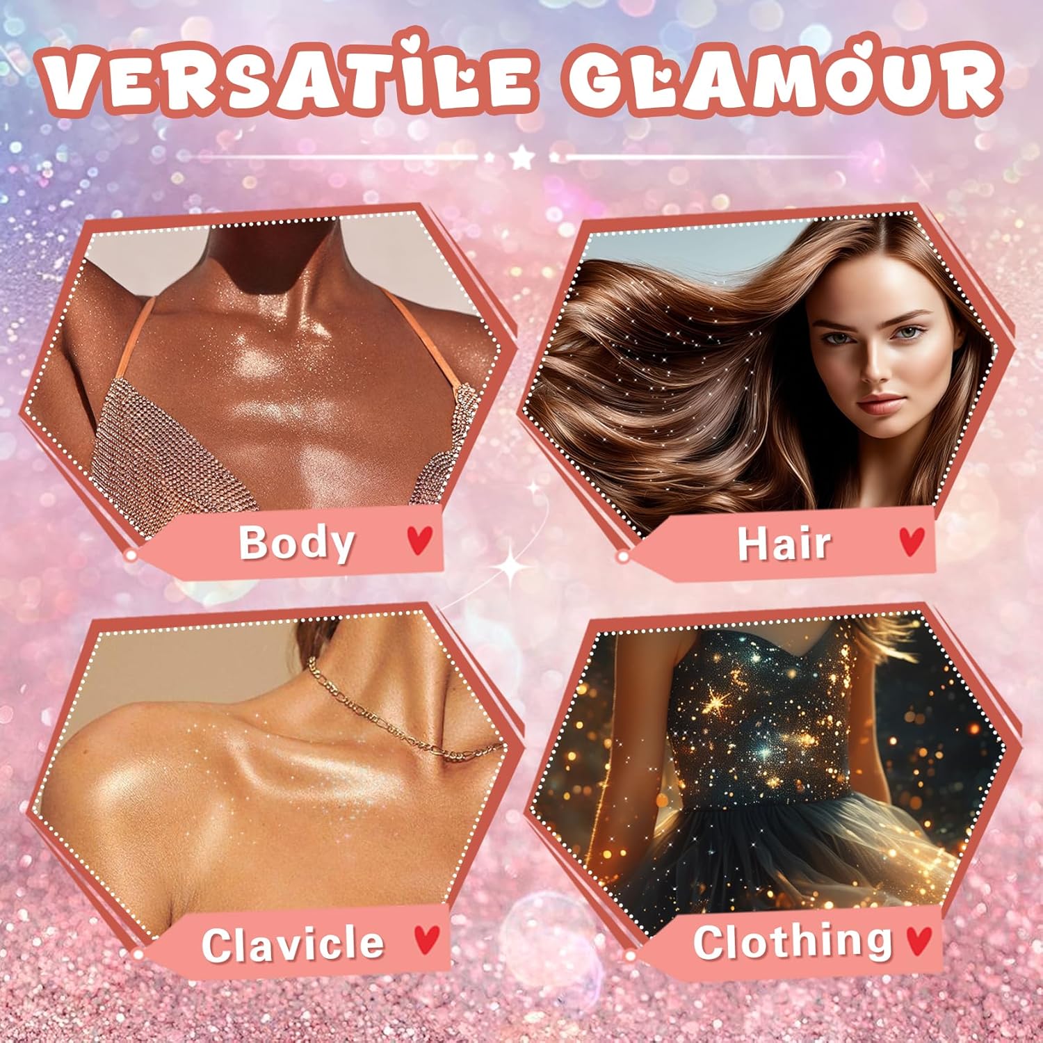 - 【Versatile Use】Apply to the skin to add sparkle to your legs,shoulders,neck,and hair;use on clothing,DIY decorations,or nail art to create a stunning visual impact and enhance the festive and party atmosphere