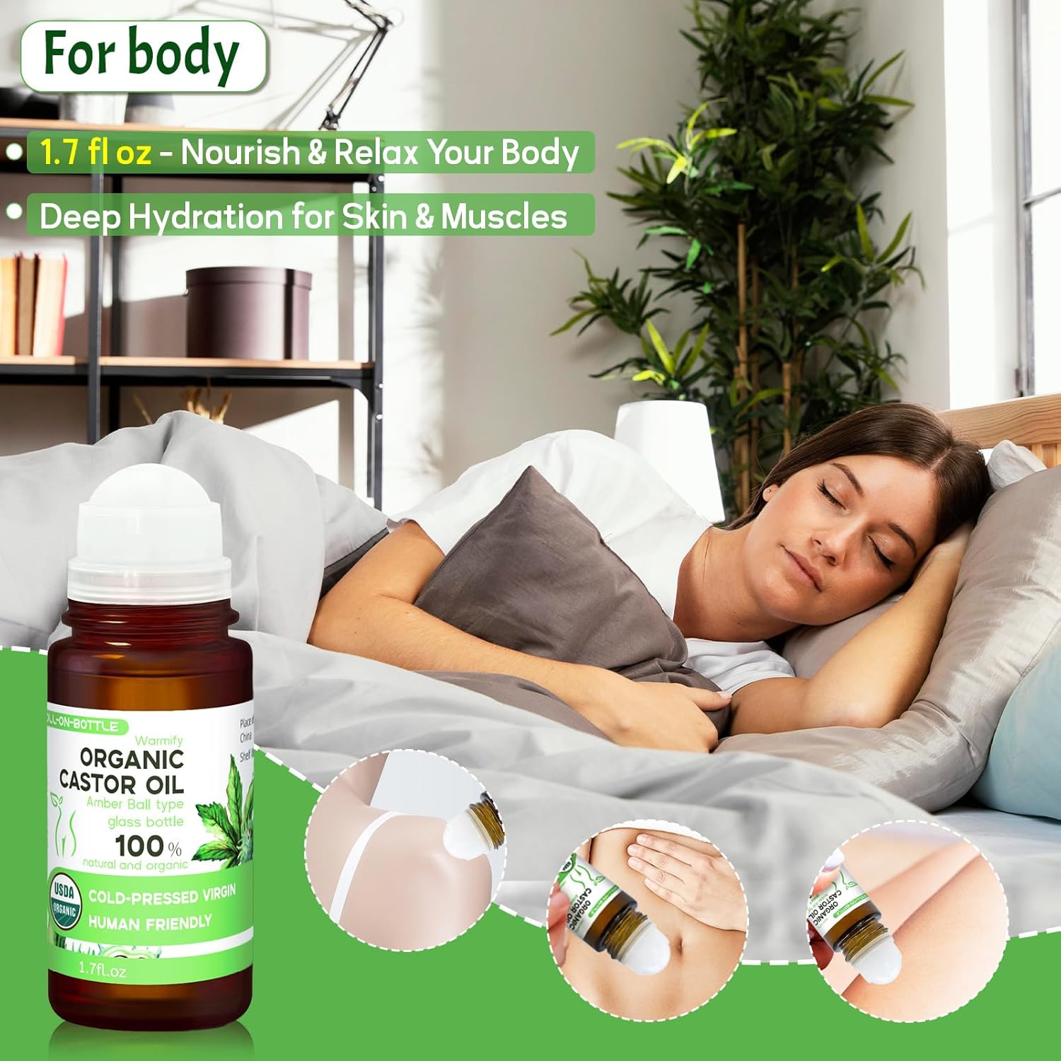 - PRECISE & SMOOTH APPLICATION - Each bottle of castor oil is designed with a roller ball that glides smoothly for controlled oil flow and hygienic use. 6-in-1 design, precise care, great for delicate areas like eyes and lips, as well as larger areas such as arms, back, and belly.