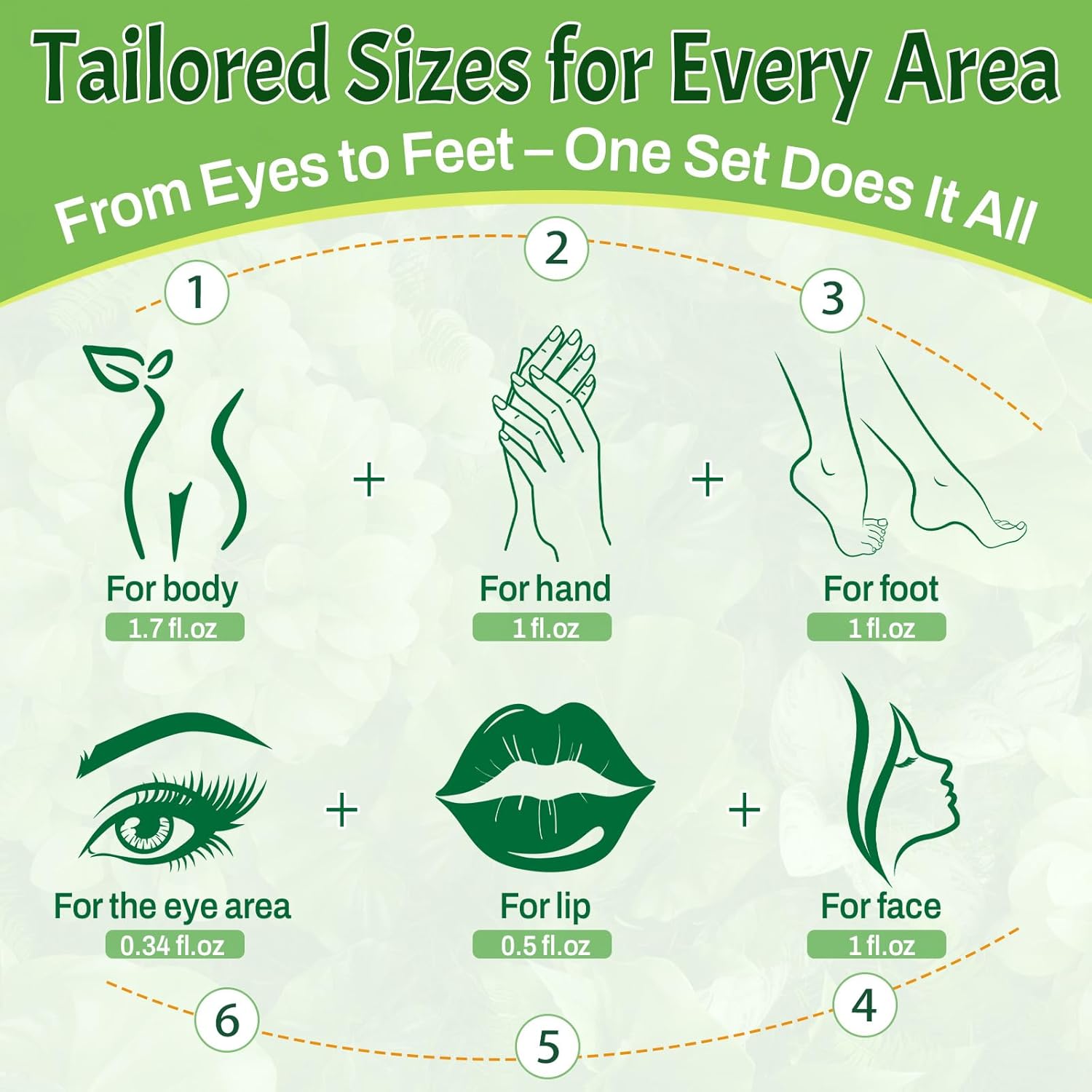 - 6-IN-1 TARGETED ROLLER SET - Includes three roll-on bottles for customized care:0.3 fl.oz for under-eye and dark circles ,1 fl.oz for face 0.5 fl.oz for Lip area,1 fl.oz for hand,1 fl.oz for feet,Very suitable for moisturizing in autumn and winter1.7 fl.oz for body massage and skin care .Each bottle is labeled for easy identification, perfect for daily use and travel.