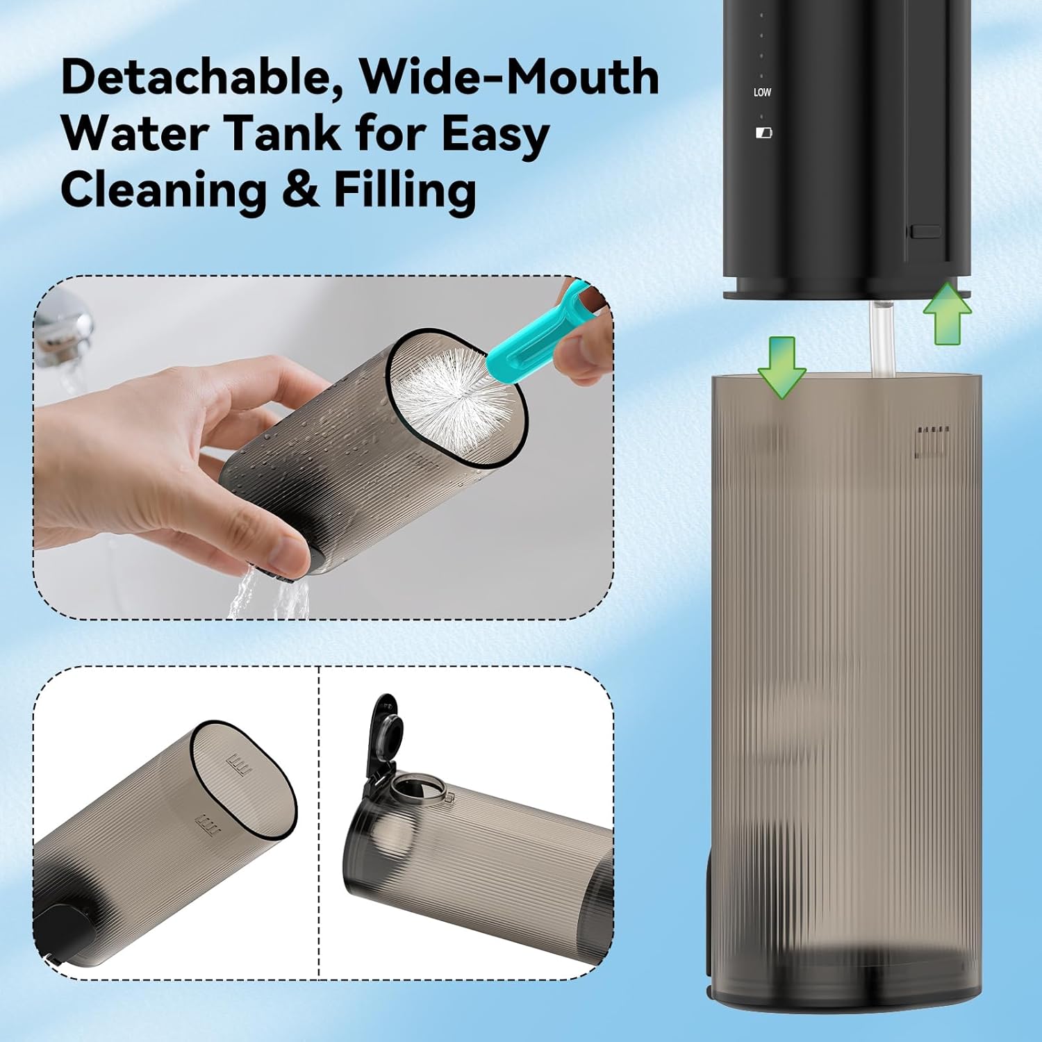 • Compact Design with Collapsible Water Tank – Easy to Fill, Clean and Store:Comes with a 200ml collapsible and detachable water tank that makes storage simple and supports easy daily refills and cleaning. The wide opening allows quick water filling and thorough rinsing. Built with IPX7 waterproof protection, The flosser is safe to use and rinse directly in the bathroom