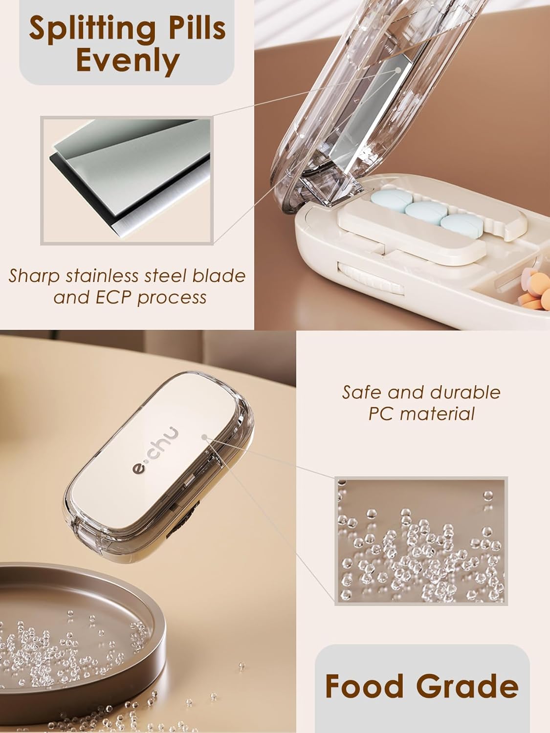 - Safe and Sturdy: The steel blade is sharp and easily splits small or large pills and tablets; its PP quality and stylish appearance stand up to repeated use