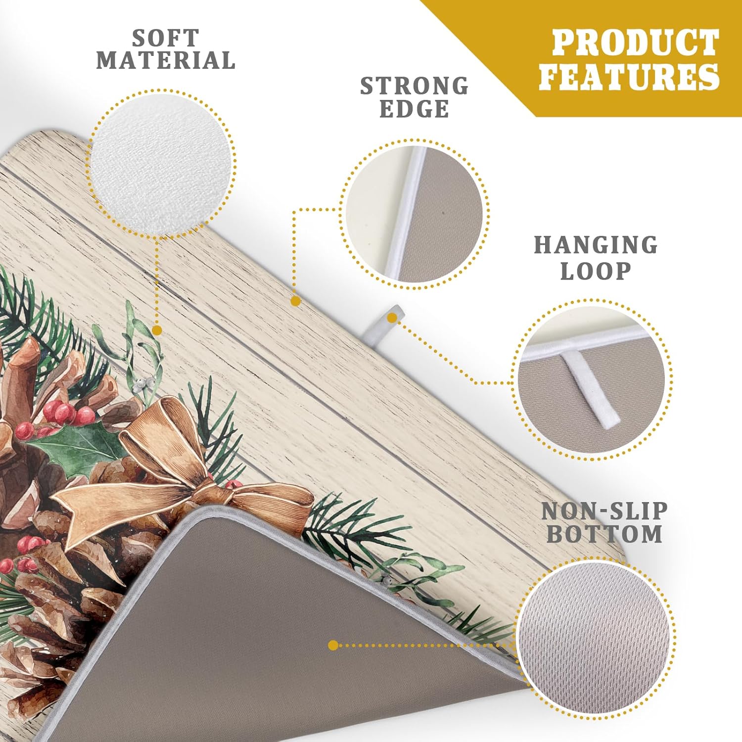 Winter Pine Cone Dish Drying Mat Holly Berries Dish Draining Mat Microfiber Washable Dish Drainer Rack Mat for Home Kitchen Counter 18"x24"
