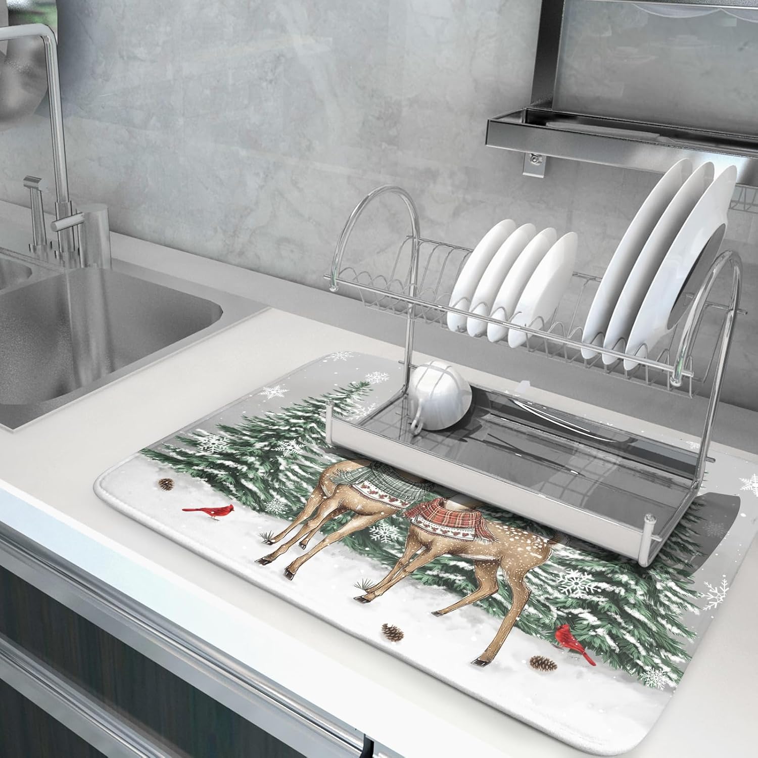 Winter Deer Dish Drying Mat Pine Tree Absorbent Dish Dry Pad Seasonal Microfiber Dish Drainer Mats for Kitchen Counter Coffee Bar 18x24 in