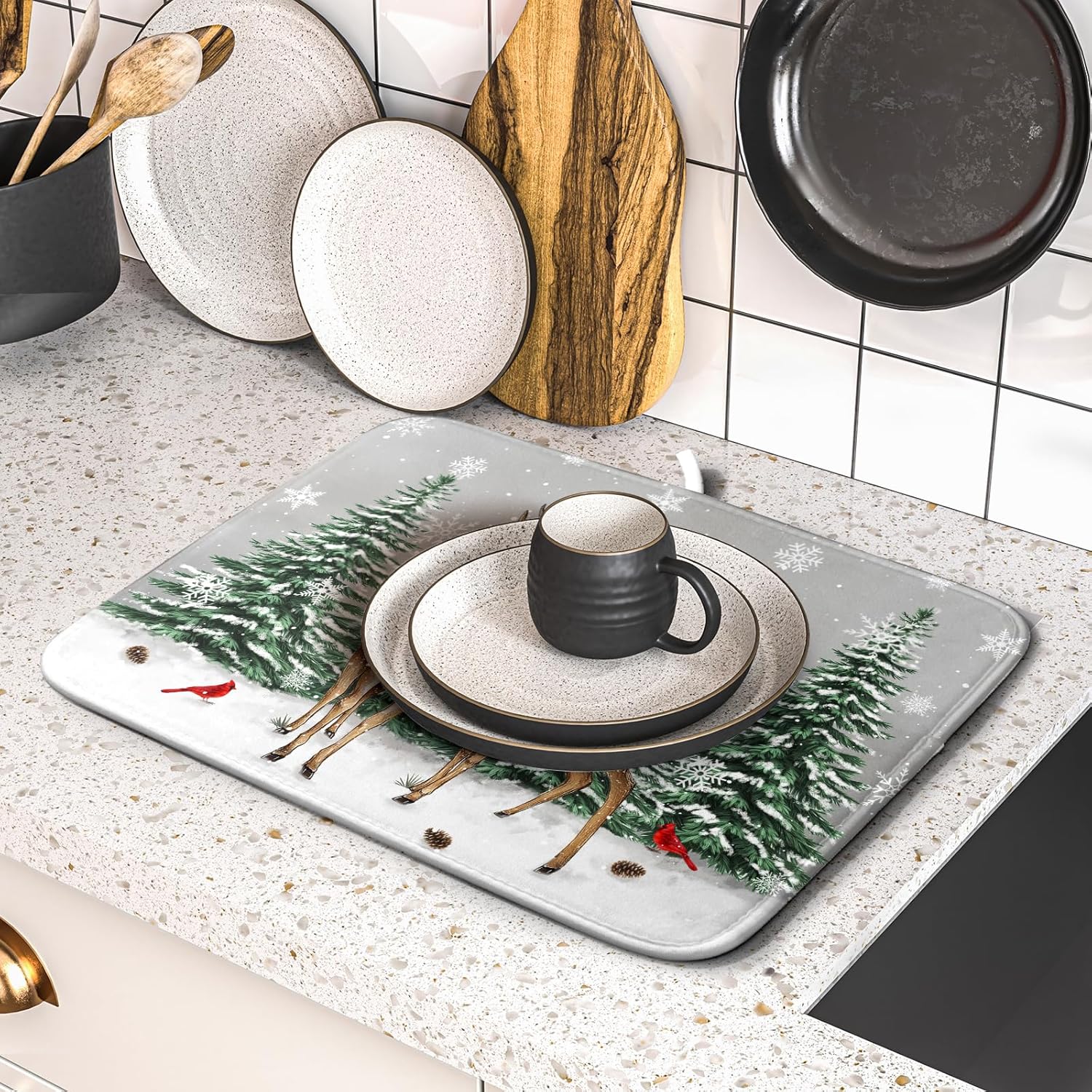 Winter Deer Dish Drying Mat Pine Tree Absorbent Dish Dry Pad Seasonal Microfiber Dish Drainer Mats for Kitchen Counter Coffee Bar 16x18 in