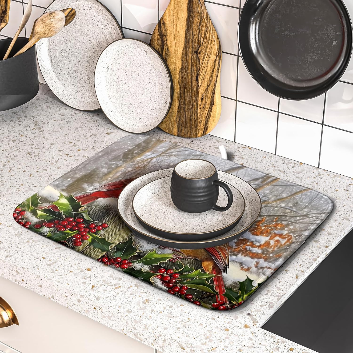 - 【Protect Tableware】Place your dishes on it or under dish racks, the cardinal bird dish mat prevents bowls, glassware, and more tablewares from being scratched or worn, can be used as dish drying mat, sink mat, dishes drainer mats to keep the countertop dry and tidy.