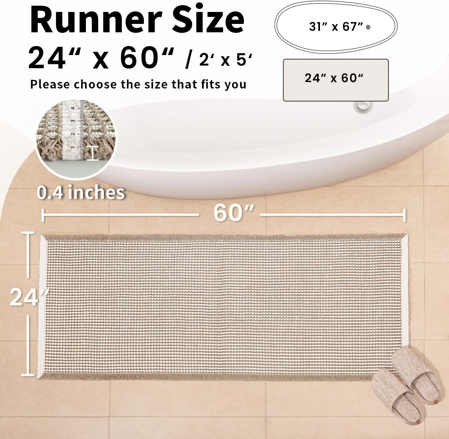 Waffle Runner Bath Mat - Long Boho Bathroom Rugs Non Slip Washable, Super Absorbent & Quick Dry, Soft Bath Mat Farmhouse Bathroom Decor, 24'' x 60'', Khaki and White