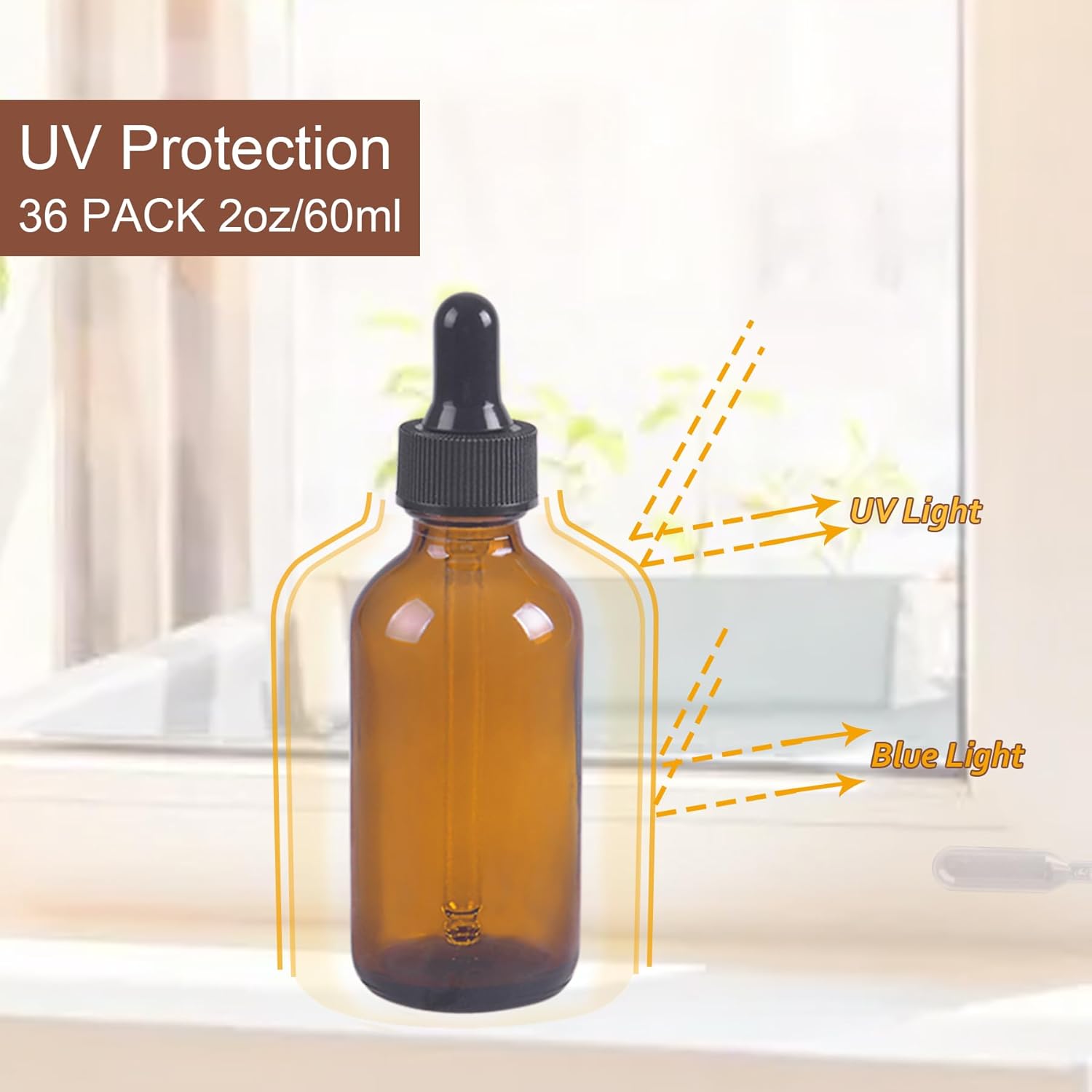 36 Pack 2oz Amber Glass Dropper Bottles, Glass Eye Dropper Bottles for Essential Oils, Perfumes, Laboratory Use (Amber, 2oz-36Pack)