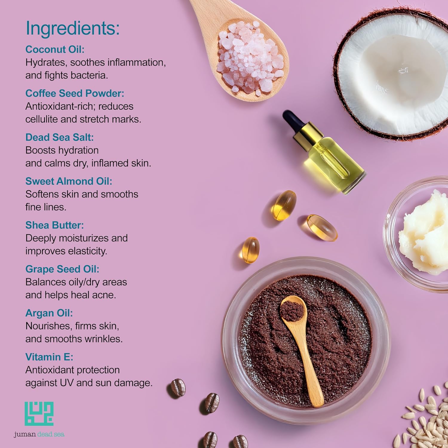 Juman Dead Sea Minerals Exfoliating Coffee Body Scrub | Enriched with Almond & Coconut Oils for Moisturized, Smooth Skin | Dead Sea Salt Scrub | SlS & Paraben Free | Vegan | 11.46 Oz