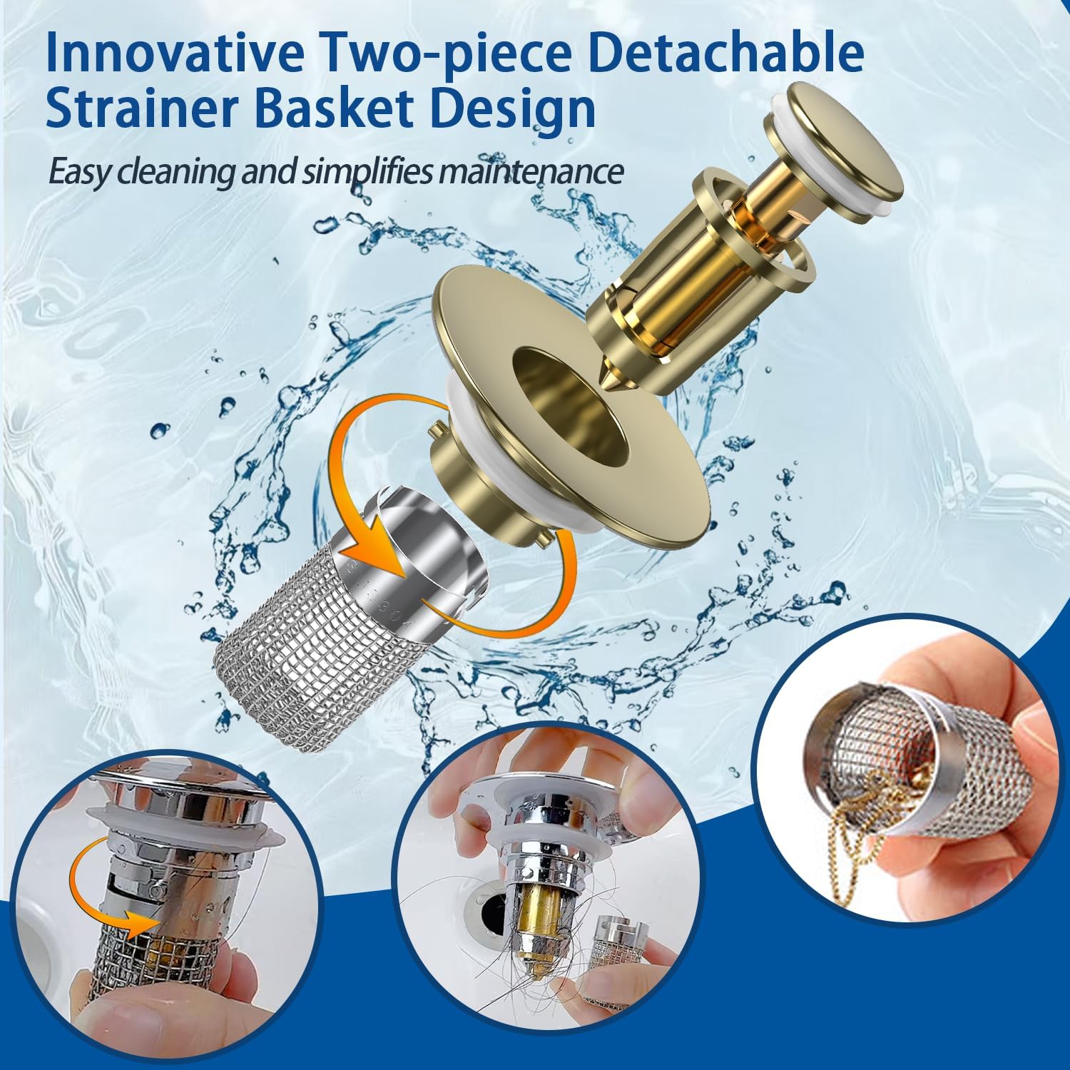 Sink Stopper Hair Catcher, Pop-up Sink Drain Strainer with Removable Stainless Steel Strainer Basket Hair Catcher, Bathroom Sink Strainer for Bathroom Sink Stopper Replacement (Brushed Gold)