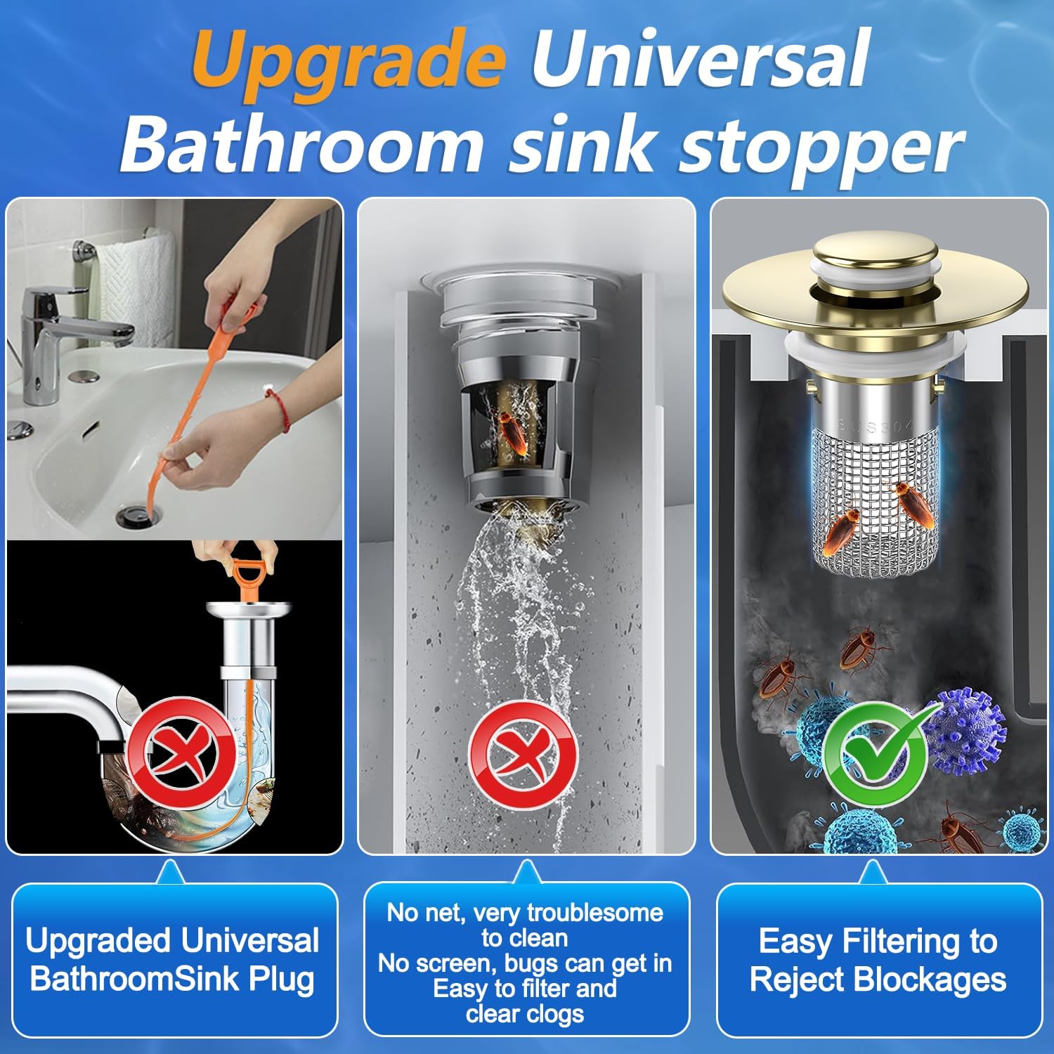 - 🔥【Pop-up Design】This bathroom sink drain strainer is engineered to catch hair and prevent clogs in your bathroom sink. The sink stopper features an easy-to-use pop-up mechanism that makes it easy and convenient to open and close the drain. With a diameter range of 1.1-1.45 inches, it fits most American bathroom sink stopper and is an effective drain strainer. The brass core construction ensures durability and long-lasting performance, making it a great choice for all bathroom sinks.