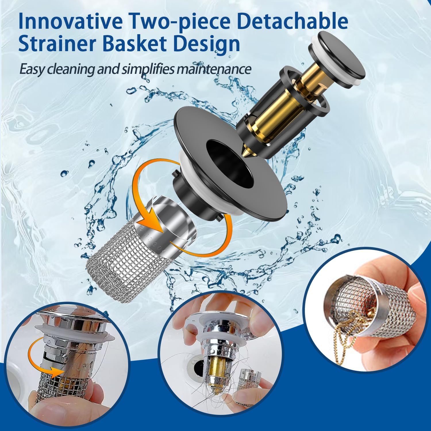 - 🔥【Pop-up Design】This bathroom sink drain strainer is engineered to catch hair and prevent clogs in your bathroom sink. The sink stopper features an easy-to-use pop-up mechanism that makes it easy and convenient to open and close the drain. With a diameter range of 1.1-1.45 inches, it fits most American bathroom sink stopper and is an effective drain strainer. The brass core construction ensures durability and long-lasting performance, making it a great choice for all bathroom sinks.