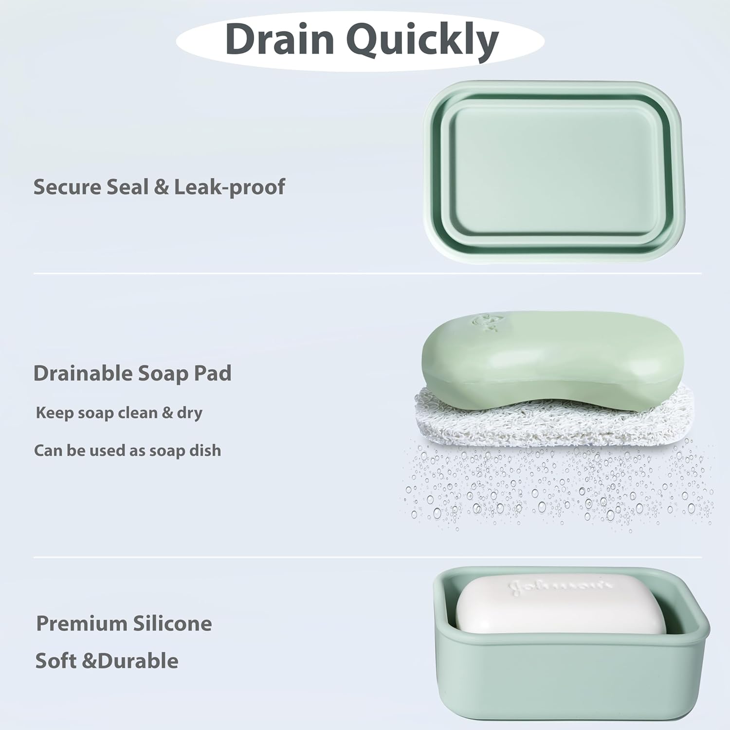 - Soap Saver to Keep your Soap Dry: Both silicone soap containers have a soap saver pad. You can take it out and use it as soap pad or you can use it as a drainage layer. The design of the soap pad makes it easy to drain the water and prevent the soap from melting.