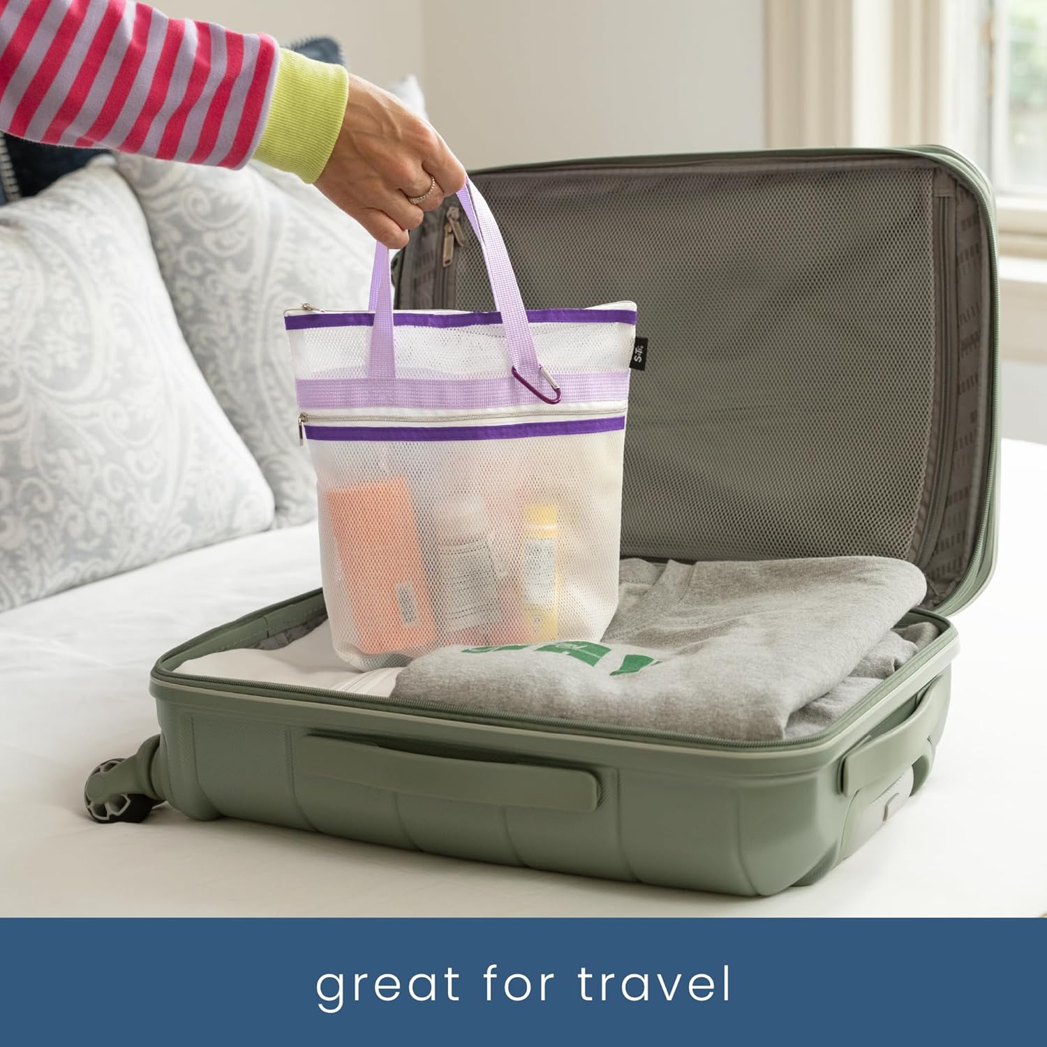 S&T INC. Mesh Shower Caddy, Shower Bag for Dorm Room Essentials, Gym Bag, Camping and More, Two Zippered Pockets, White and Purple, 10 Inches x 10 Inches