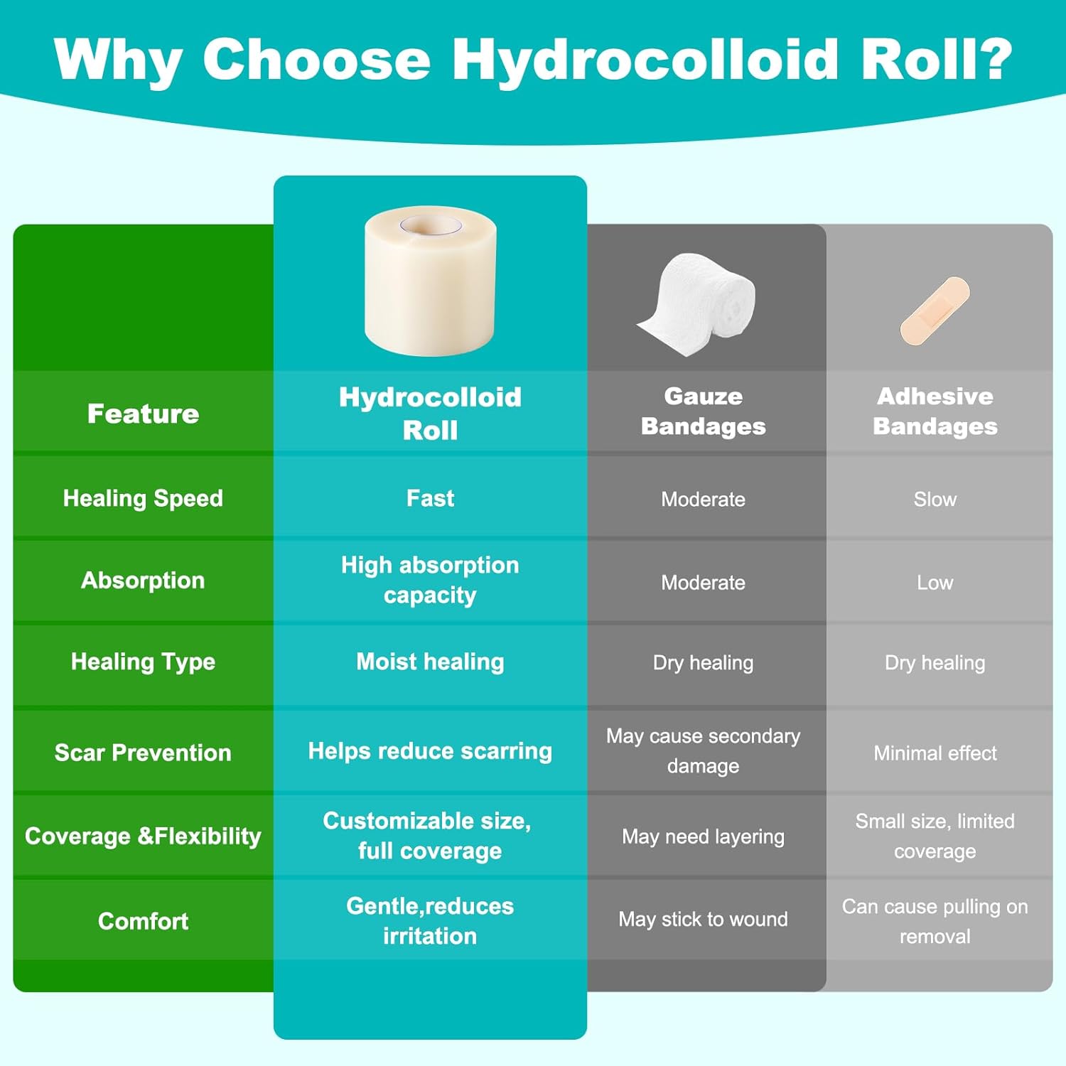 Hydrocolloid Roll for Wound Care, Hydrocolloid Bandages with Self-Adhesive, Cut-to-Size Patch Bandages, Ultra Absorbent, Waterproof, First Aid Kit Essential (2IN*4.8FT)