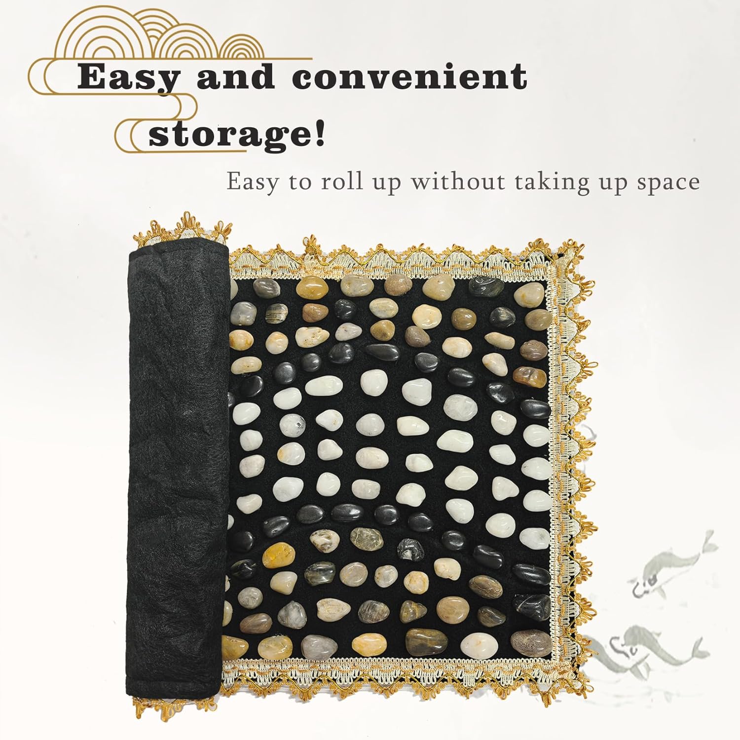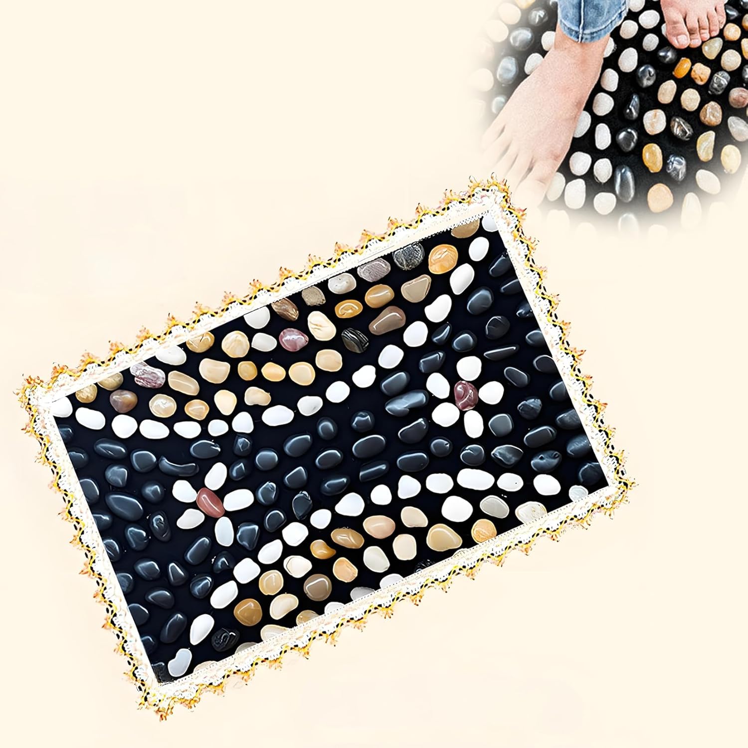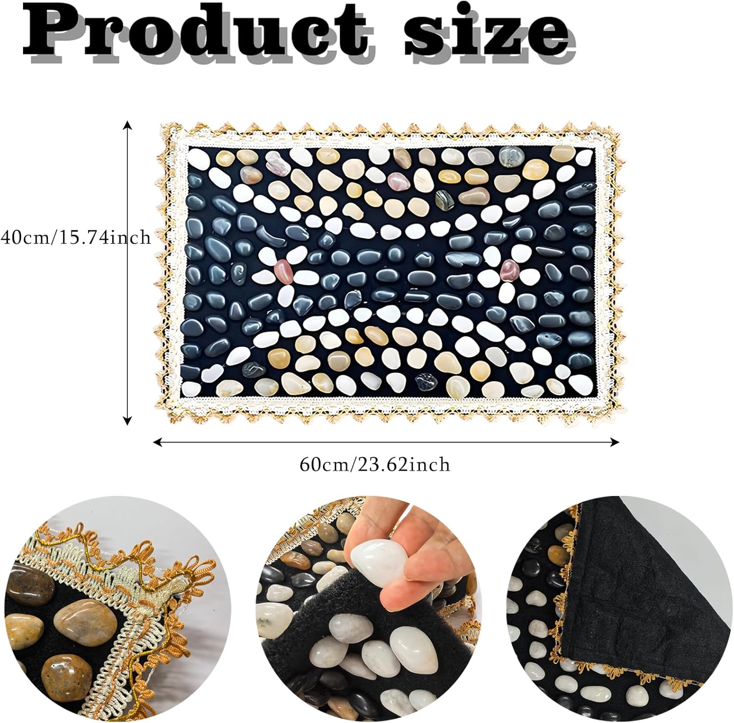 - Natural Pebble Design for Lasting Relief: Features a flexible fabric base with securely attached pebbles and an elegant decorative lace border. This durable construction ensures a consistent and relaxing massage every time you walk on it, helping to reduce stress and improve overall sleep quality