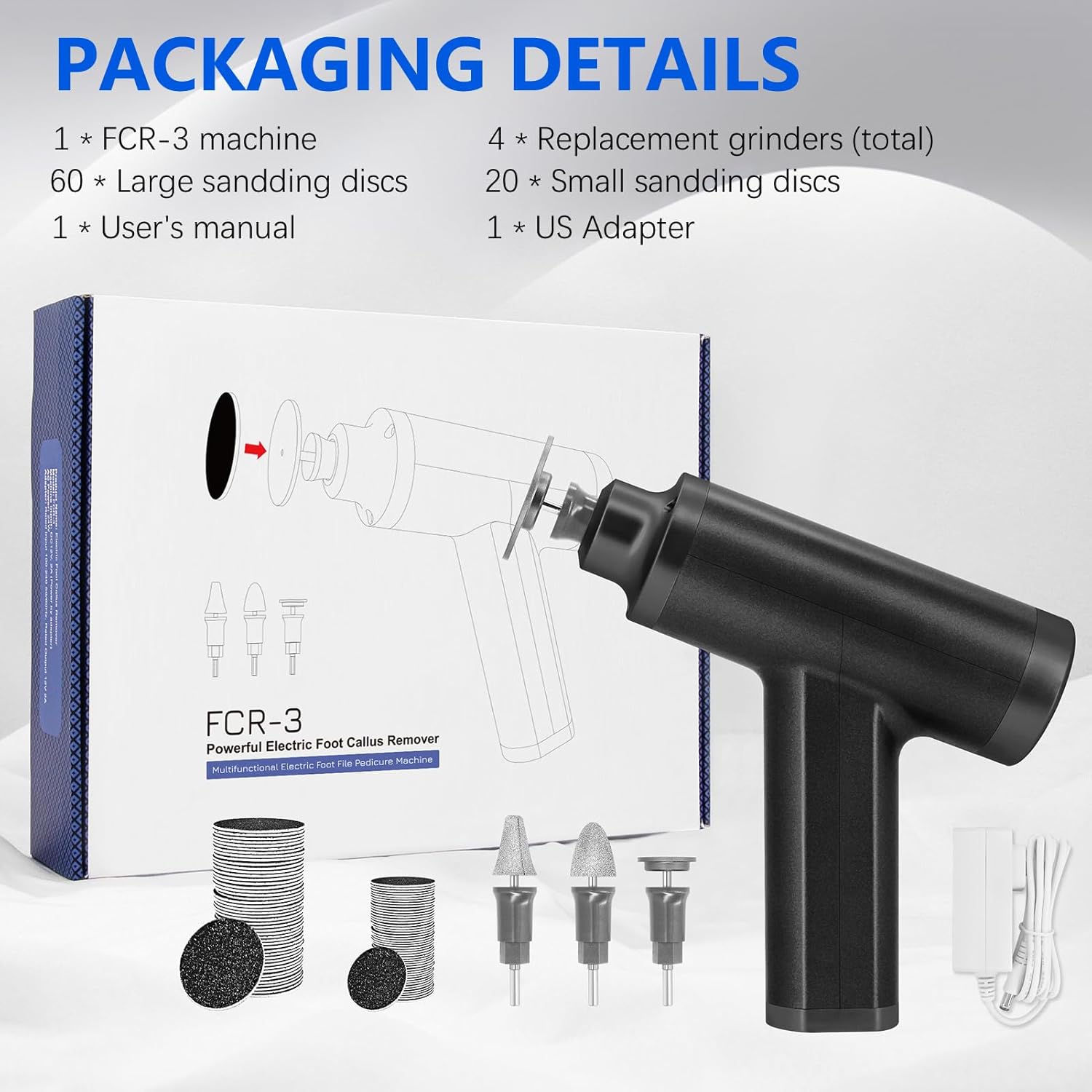 - PACKAGE DETAILS: 1pc professional FCR-3 electric foot callus remover (black), 1pc big round grinding head (use with big sandpaper), 1pc small round grinding head (use with small sandpaper), 2pc tapered grinding heads (no need sandpaper), 60pcs big sandpaper discs, 20pcs small sandpaper discs…The machine's ergonomic design ensures a comfortable grip and comes with a clear instruction manual.