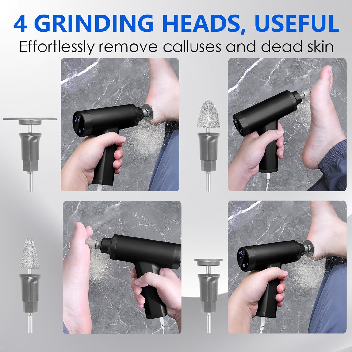 - 4 REPLACEABLE GRINDING HEADS: This professional electric foot callus remover comes with 4 grinding heads, 1 big round and 1 small round grinding head (requires sandpaper), and 2 metal cone-shaped grinding heads (no sandpaper needed). They can remove dead skin and calluses from any area of your feet.