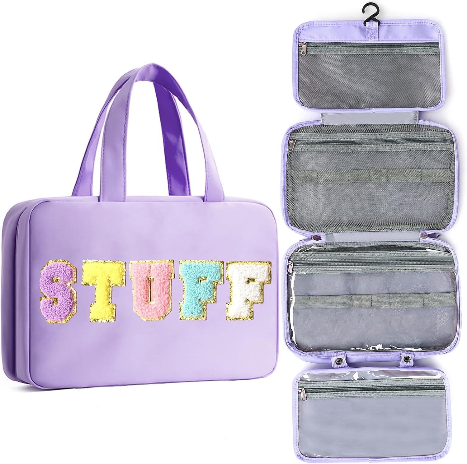 Toiletry Bag for Women Chenille Letter Makeup Bag Water-resistant Cosmetic Bag Travel Bag with Hanging Hook Preppy for Store Toiletries Cosmetic Accessories Large Capacity Purple
