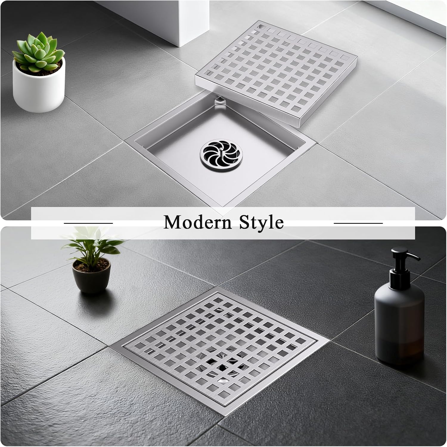 - 【Standard Universal Type】 This 6 × 6 inch square brushed nickel shower drain cover features a standard 2-inch central drain outlet—compatible with standard US NO-HUB Drain Base Systems. Its precision-engineered grating effectively traps debris and hair, ensuring unobstructed drainage.
