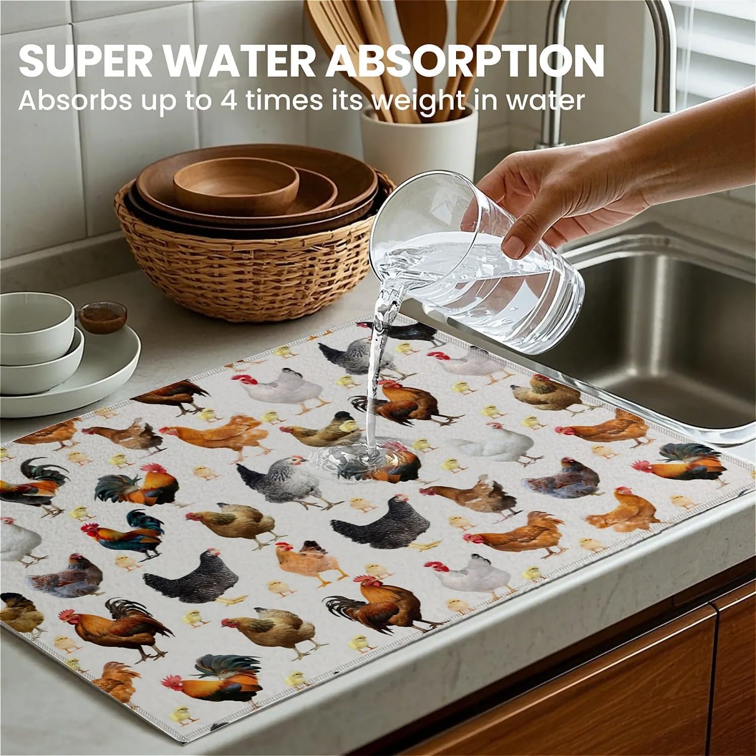 Dish Drying Mat For Kitchen Counter, Hens Roosters And Chickens Microfiber Absorbent Dish Drainer Rack Pad Reusable Large 18x24in Drying Mat