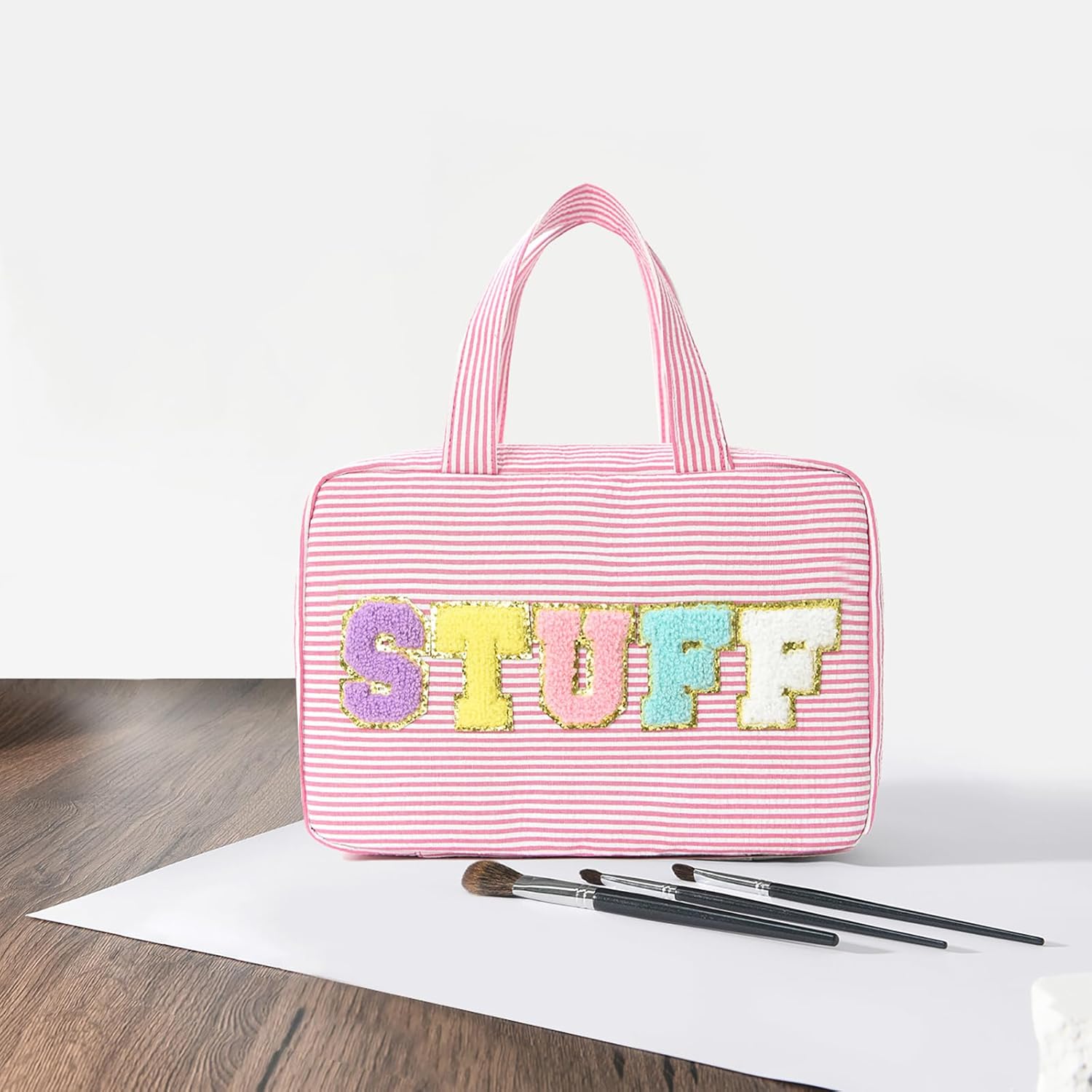- HIGH QUALITY: This toiletry bag is made of high-quality polyester with strong stitching and durable materials. It's durable, easy to use, waterproof, stain-resistant, and scratch-resistant. Fashion trends chenille letter stripes cosmetic bag, preppy, more women love it. Its stylish design will make you love it even more and make your life more beautiful