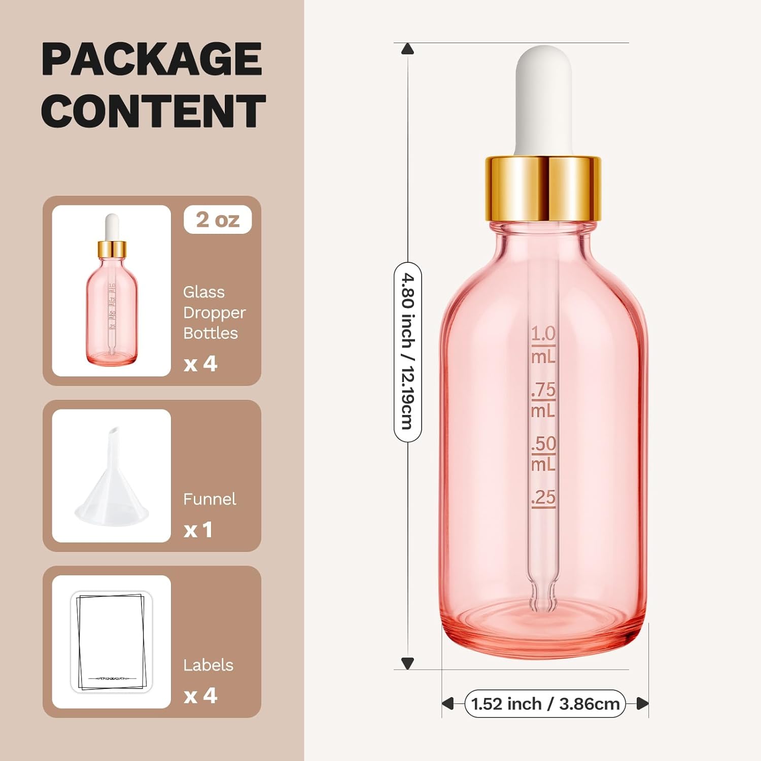 - Complete Kit for DIY: The set contains 4 packs 2 oz (60ml) glass bottles with glass measured droppers, 1 funnel, 1 transfer pipette, and 4 labels for organization.