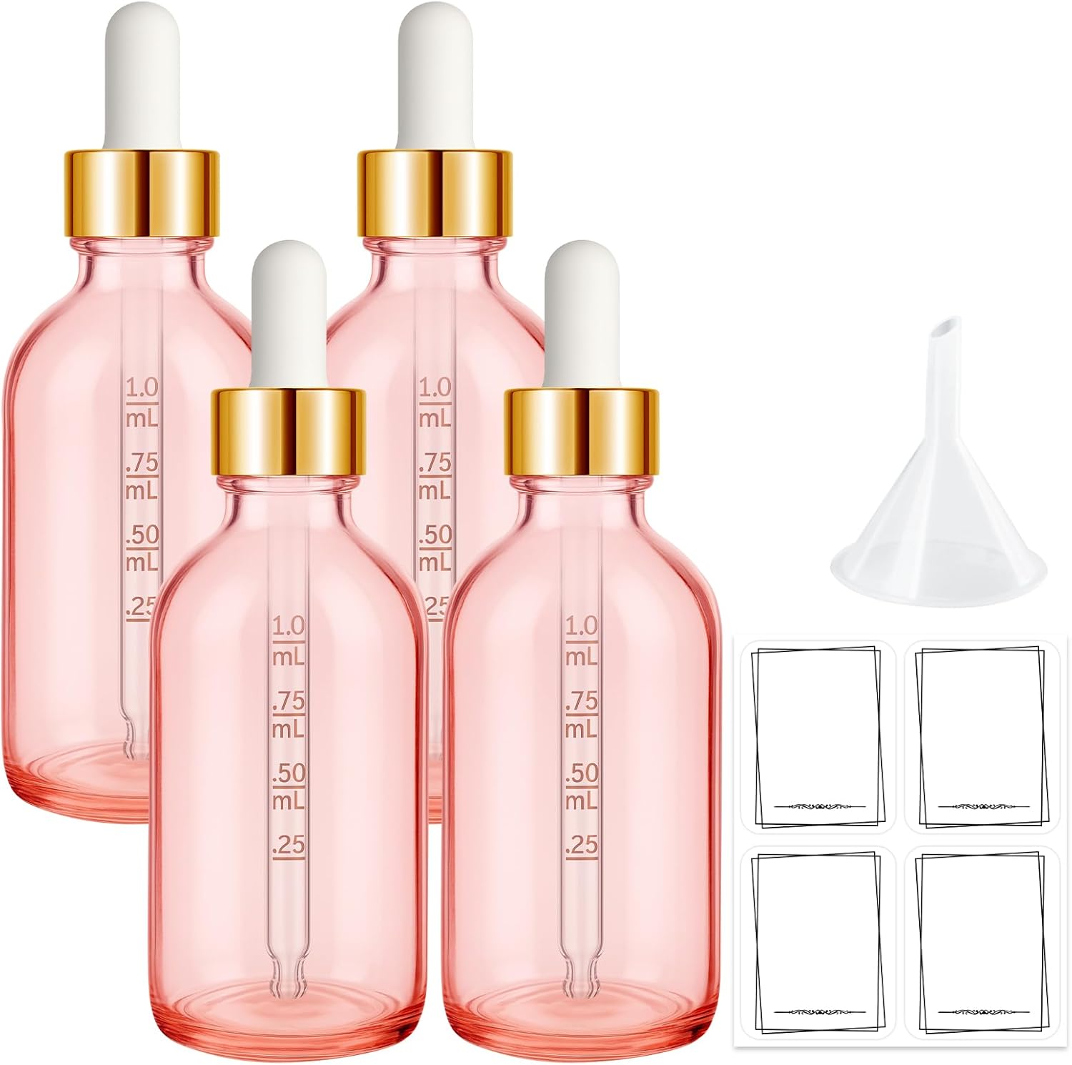 Bumobum 2 oz Dropper Bottle, Pink Glass Dropper Bottle with Measured Dropper & Golden Cap, Empty Eye Tincture Bottles with Funnel, Pipette & Labels for Essential Hair Oils Serums, 4 Pack