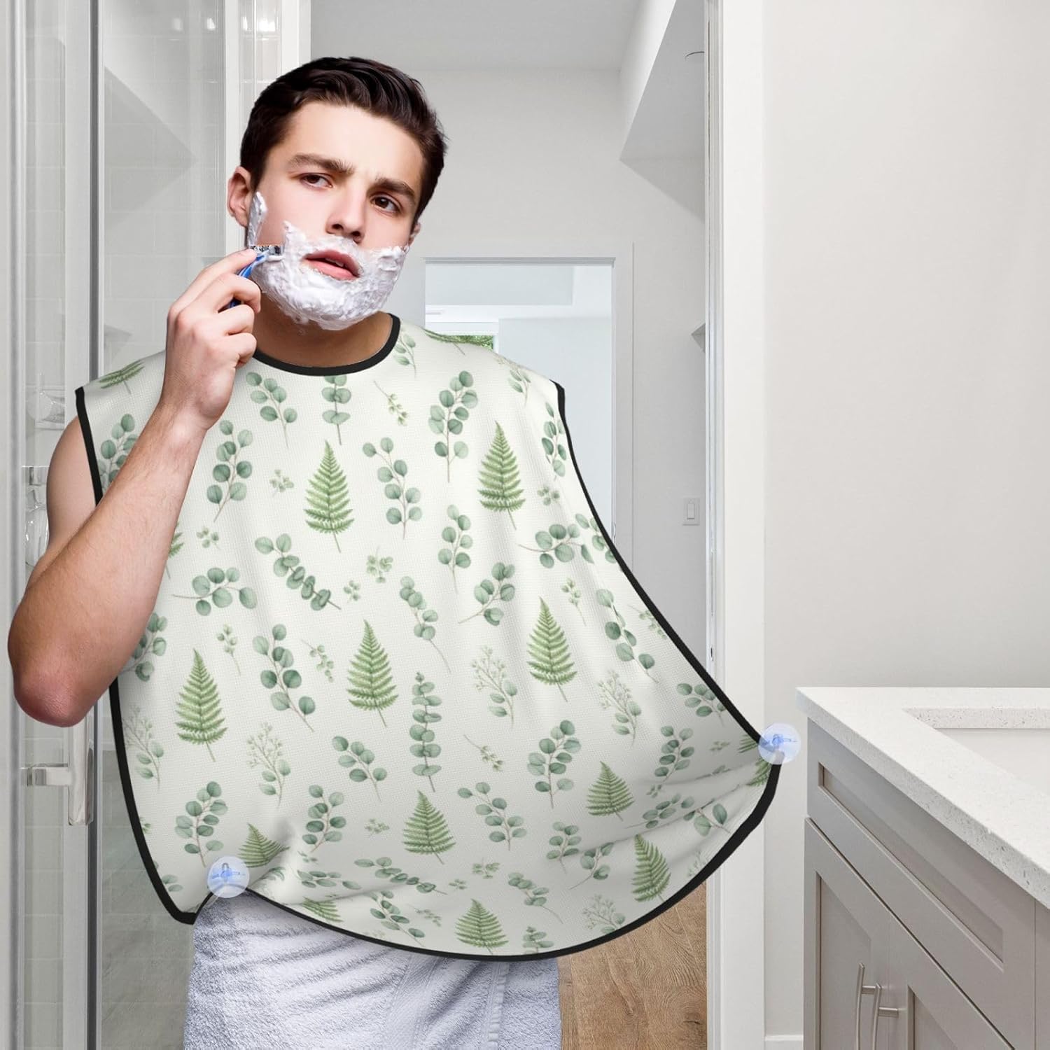 No-Slip Shaving Bib, Beard Grooming Apron with Strong Suction Cups, Watercolor Sage Green Leaf