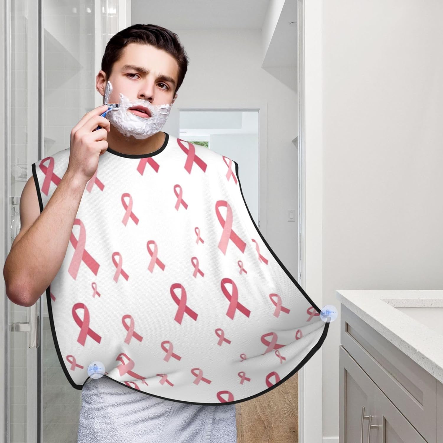 Waterproof Grooming Apron, Non-Stick Beard Bib with Suction Cups, for Breast Cancer Awareness Pink Ribbons White