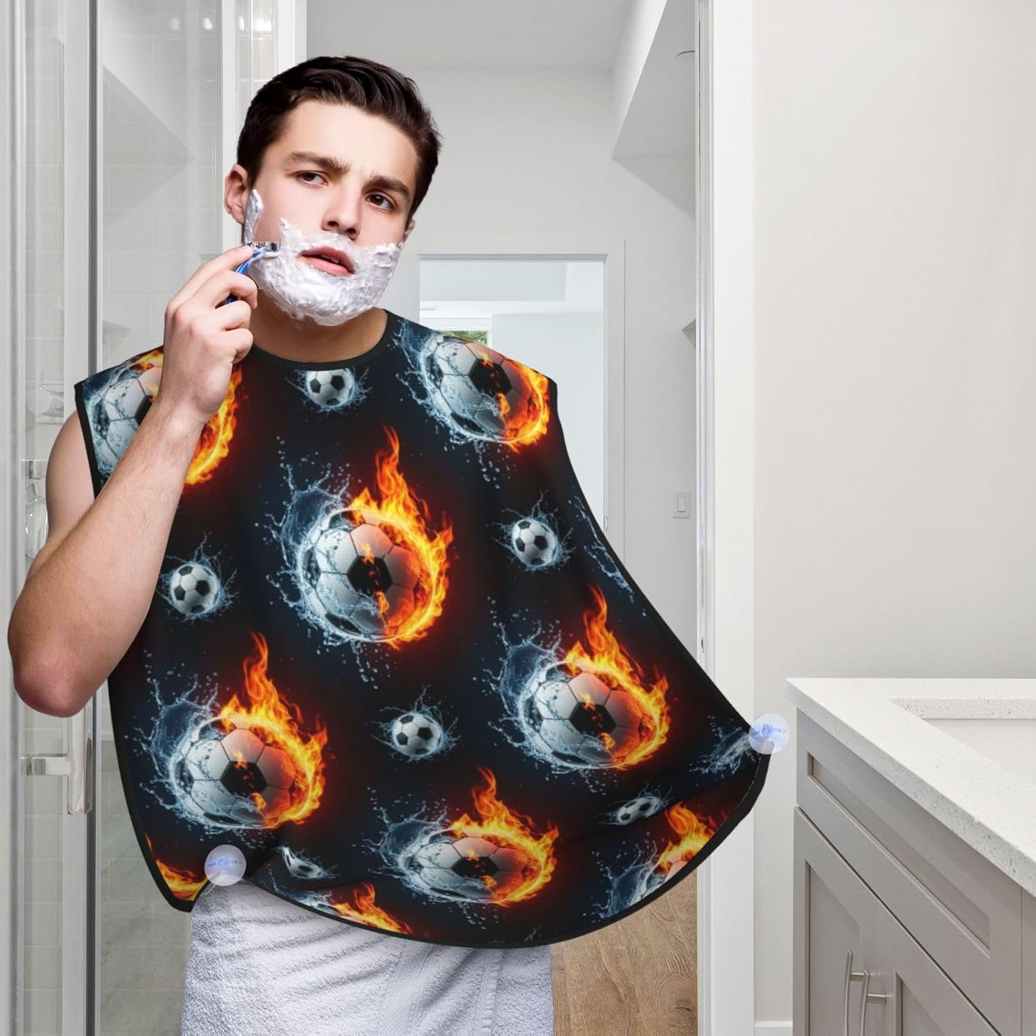 Beard Bib with 3 Suction Cups, Non-Stick Waterproof Hair Catcher Apron, Men's Shaving Essential for Grooming, Water Fire Soccer Ball Shave Bib