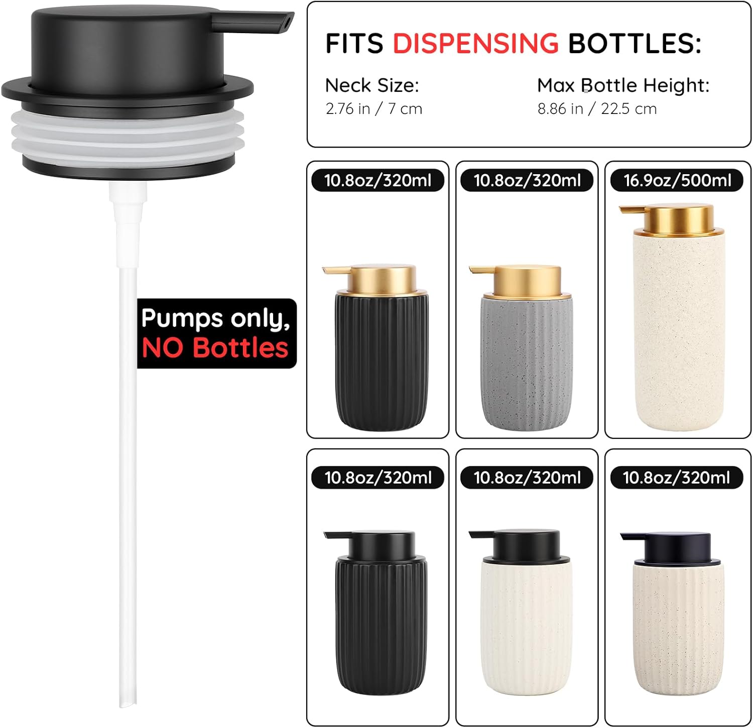 - PUMPS ONLY, NO BOTTLE. Match Bottle Neck Size: Dia. 2.76in/7cm, Max Bottle Body Height: 8.86in/22.5cm. Please be sure to refer to the MEASUREMENT of the fitting BOTTLE SIZE. You will get 2pcs soap dispenser pump head replacement for shampoo